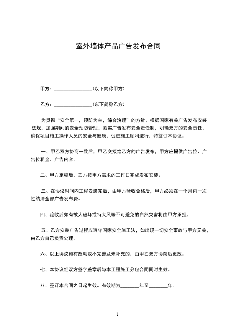 五、乙方安装广告过程应遵守国家安全施工法,如出现一切安全事故与甲方无关,由乙方自己负责处理。
