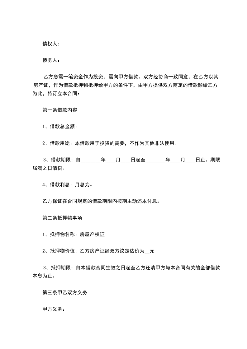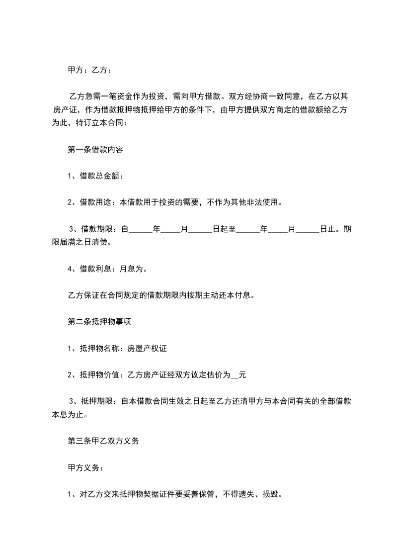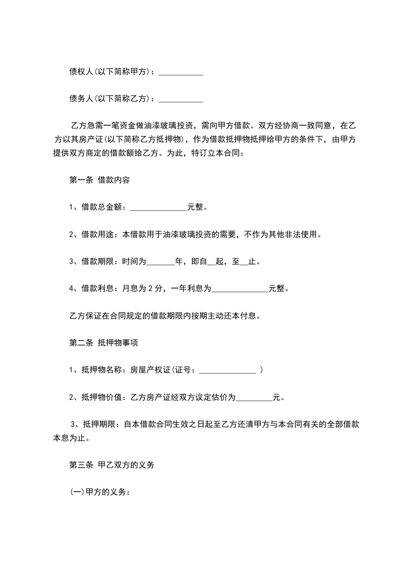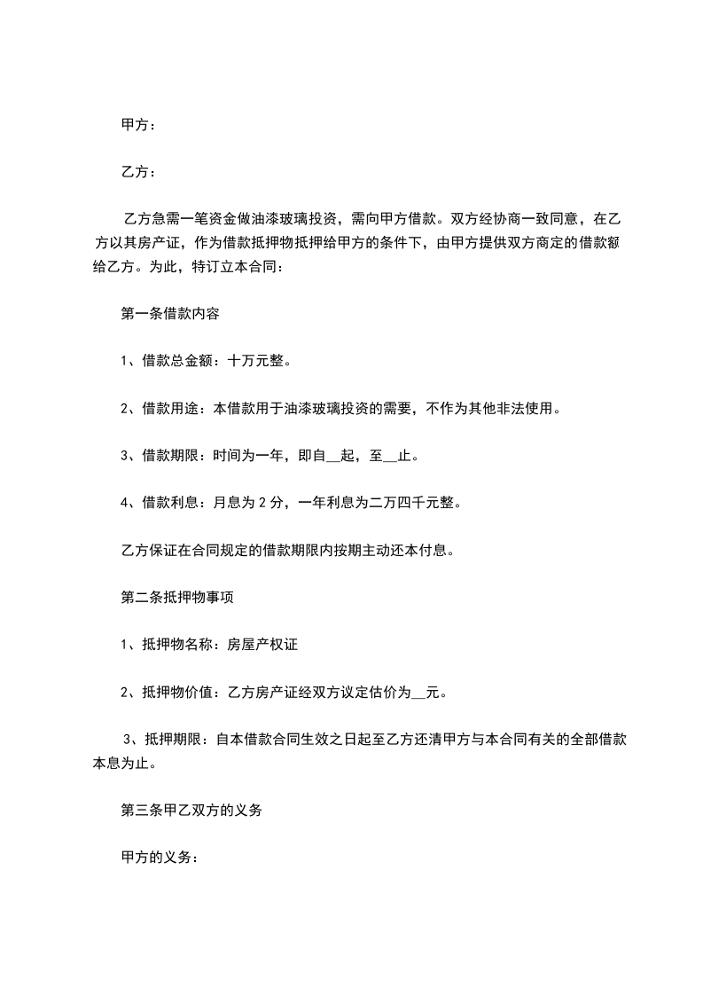 乙方急需一笔资金做油漆玻璃投资,需向甲方借款。双方经协商一致同意,在乙方以其房产证(以下简称乙方抵押物),作为借款抵押物抵押给甲方的条件下,由甲方提供双方商定的借款额给乙方。为此,特订立本合同:、第一条借款内容