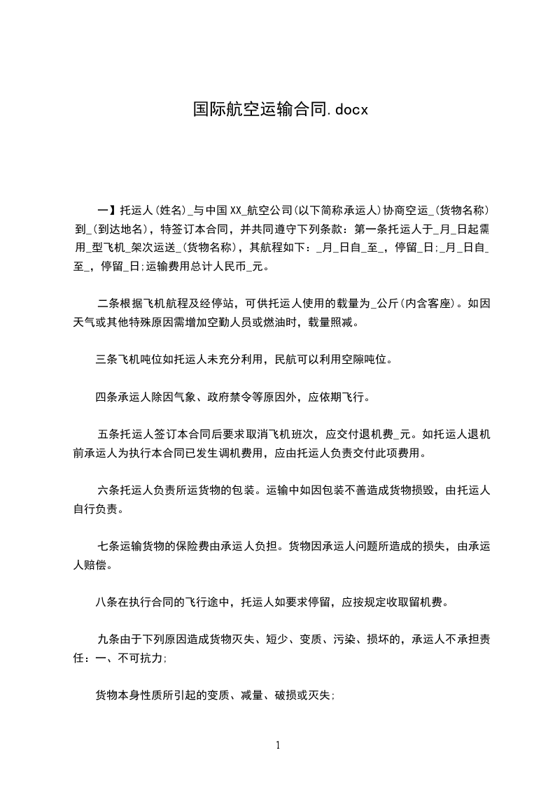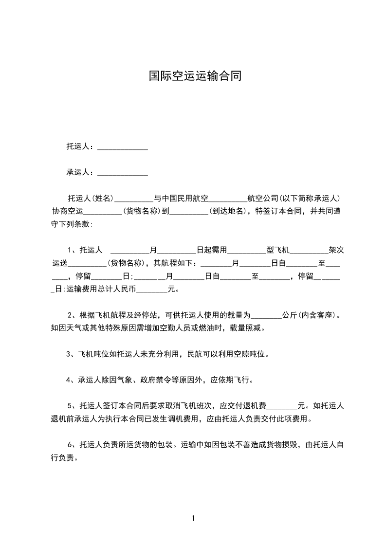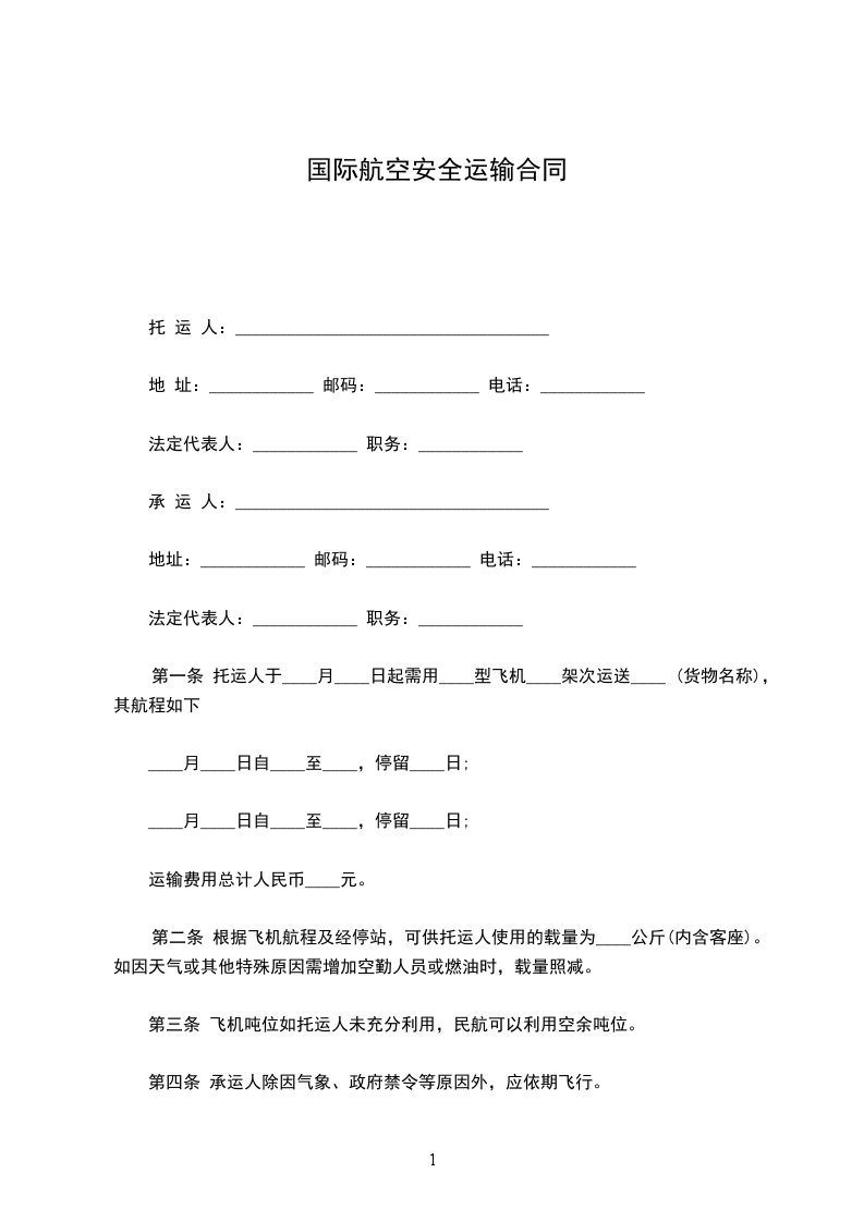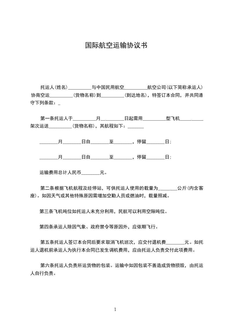 第一条 托运人于____月____日起需用____型飞机____架次运送____ (货物名称),其航程如下