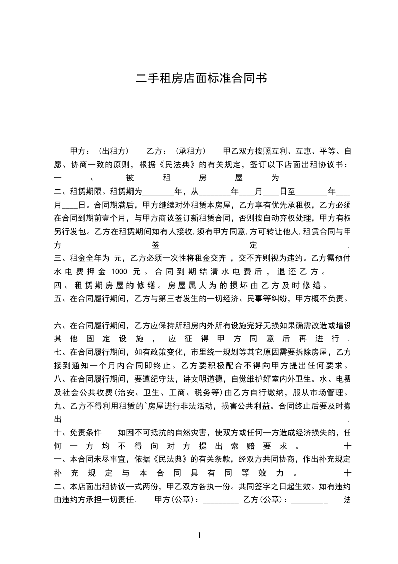 甲方: (出租方) 乙方: (承租方) 甲乙双方按照互利、互惠、平等、自愿、协商一致的原则,根据《民法典》的有关规定,签订以下店面出租协议书: