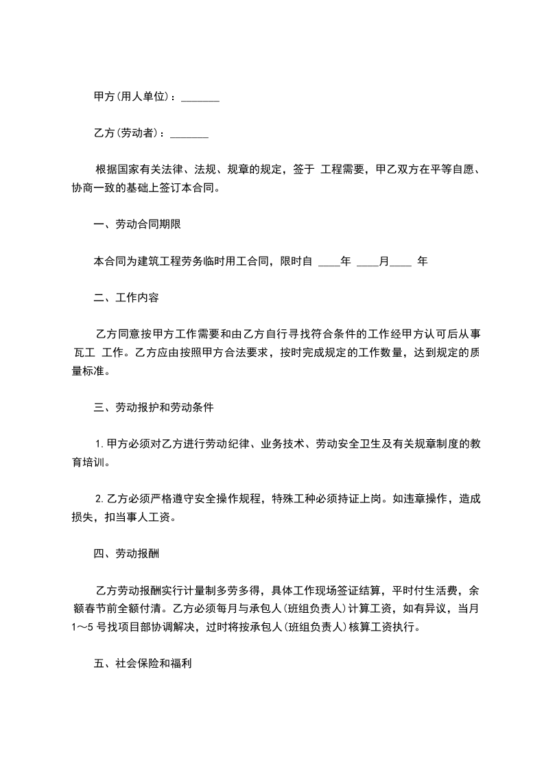 本合同为建筑工程劳务临时用工合同,限时自 ____年 ____月____ 年