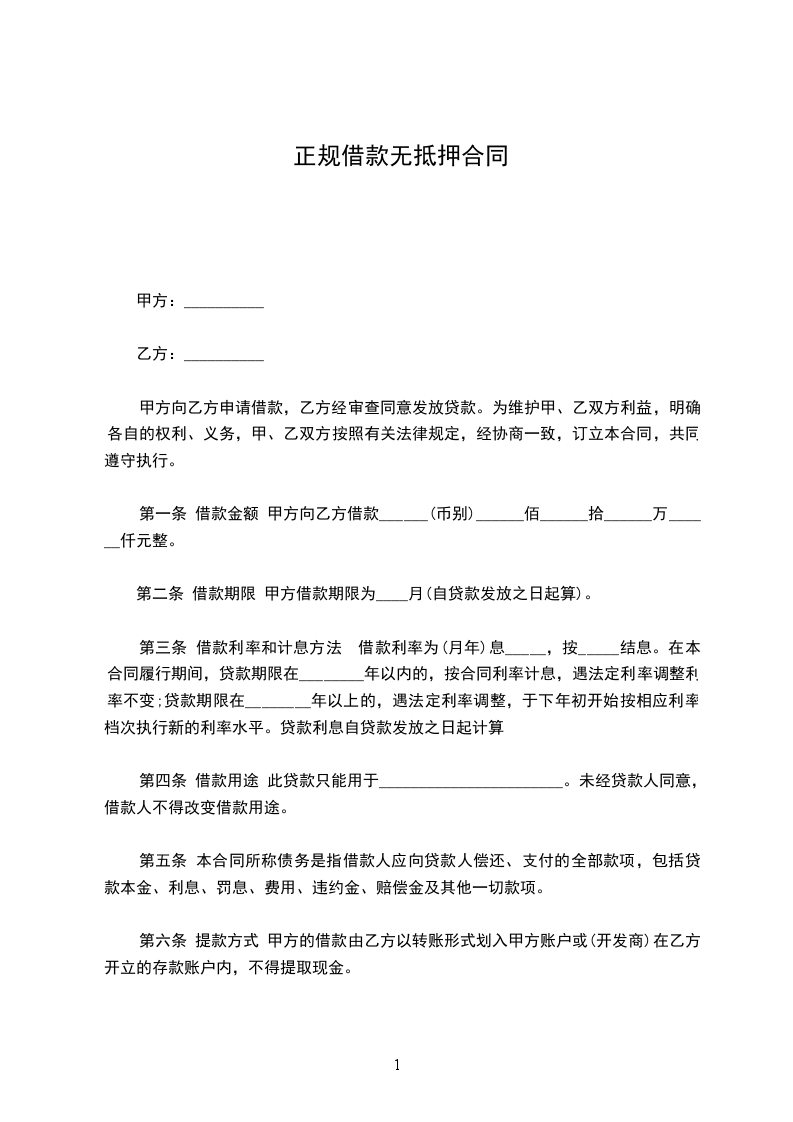 第一条 借款金额 甲方向乙方借款______(币别)______佰______拾______万______仟元整。