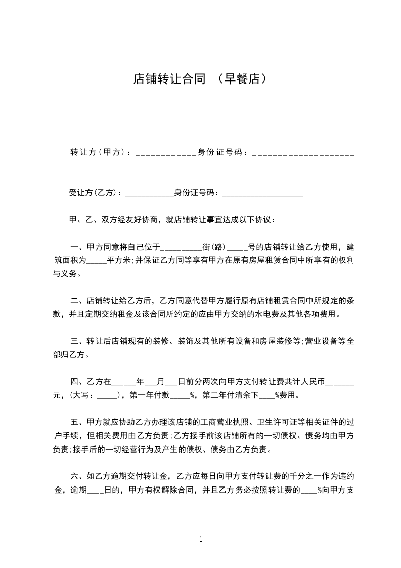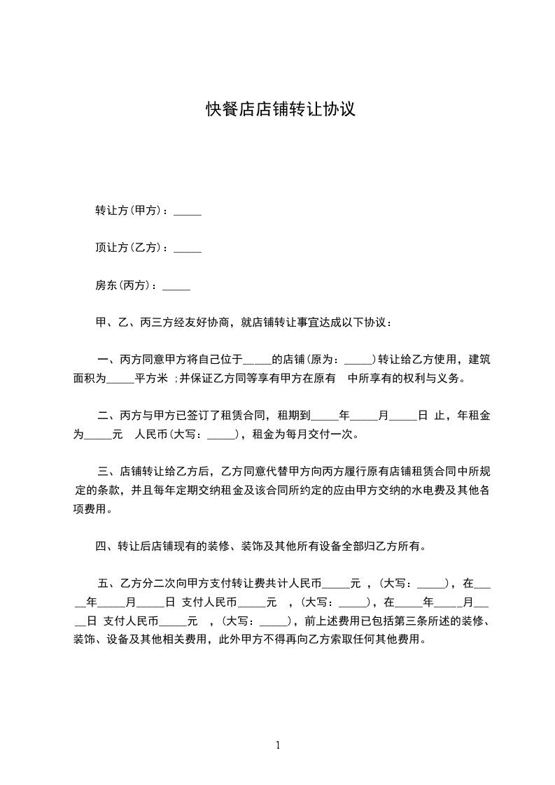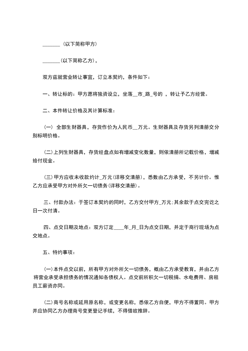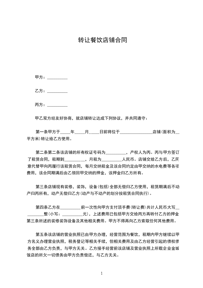 第八条 如果合同签订前政府下令撤迁店铺,甲方退还全部转让费。如果合同签订后国家命令撤除店铺,使乙方难以经营,乙方有权解除合同,甲方退还剩余租期的`转让费,押金仍归乙方,甲方在每年营业执照有效期盖满时仍未办妥年审手续,乙方有权解除合同,甲方应退回全部转让费,赔偿装修,添置设备损失 元,并支付转让费的 的违约金,