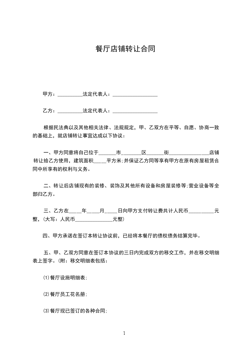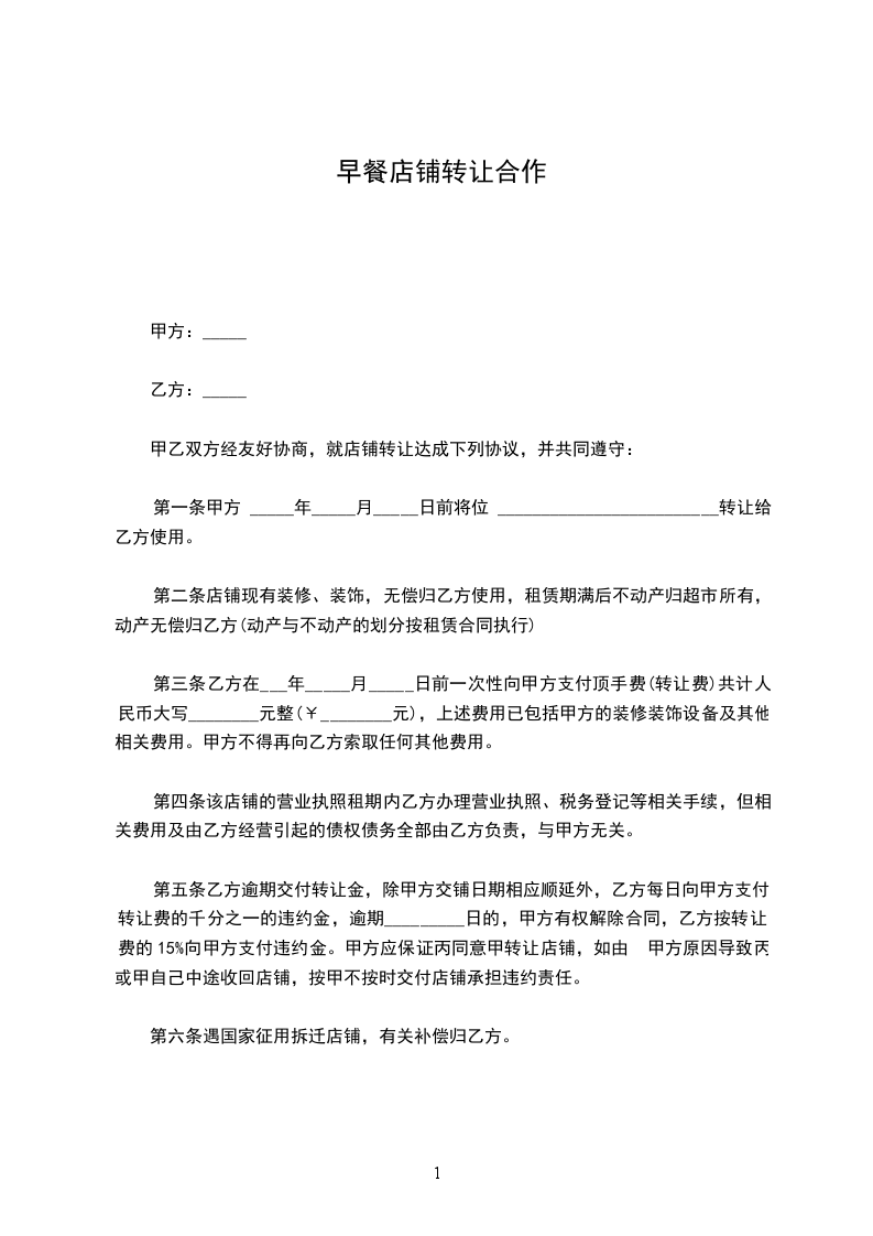 第一条 甲方与________年____月____日前将位于 商铺{面积 平方米}转让给乙方使用。