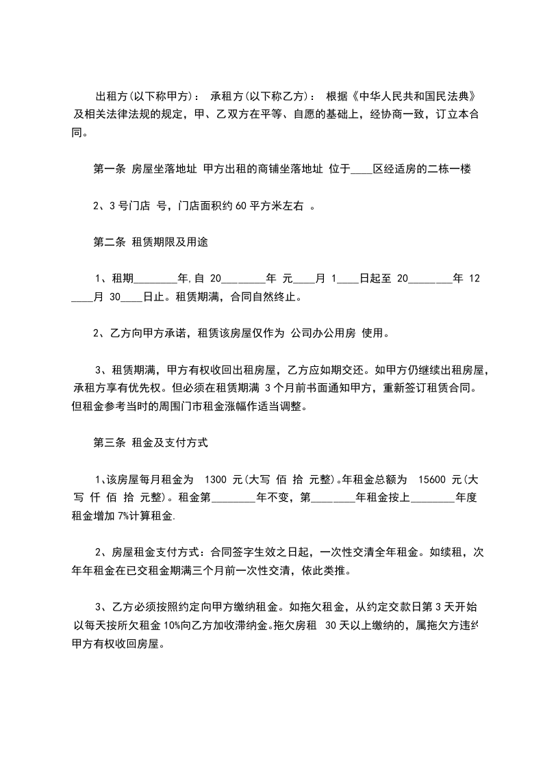1、该房屋每月租金为 1300 元(大写 佰 拾 元整)。年租金总额为 15600 元(大写 仟 佰 拾 元整)。租金第________年不变,第________年租金按上________年度租金增加7%计算租金.