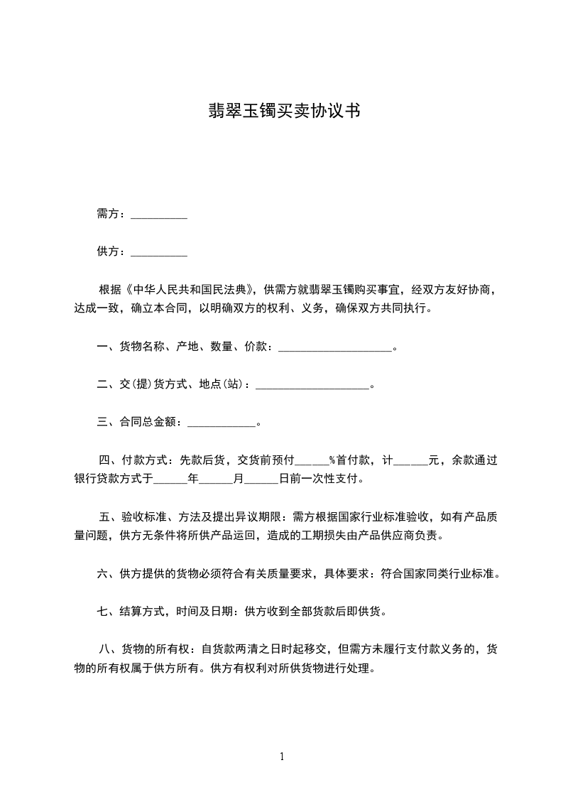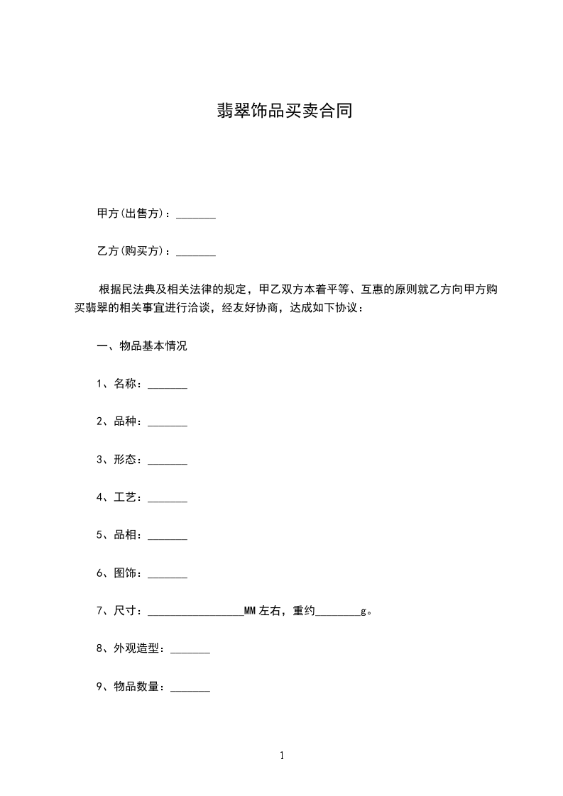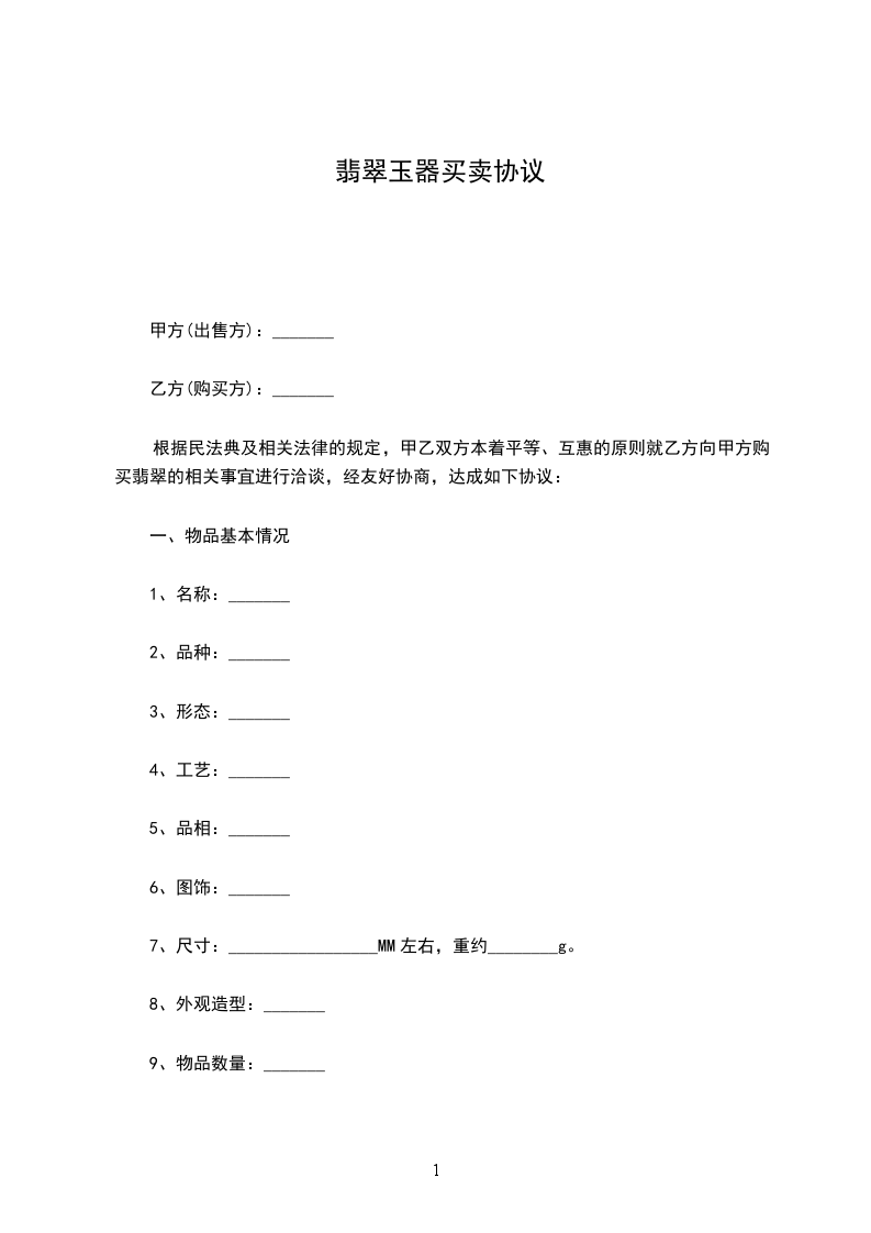 根据民法典及相关法律的规定,甲乙双方本着平等、互惠的原则就乙方向甲方购买翡翠的相关事宜进行洽谈,经友好协商,达成如下协议: