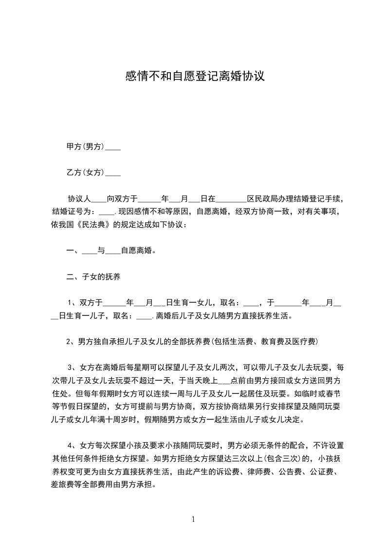 1、双方于______年___月___日生育一女儿,取名:____,于_______年____月____日生育一儿子,取名:____.离婚后儿子及女儿随男方直接抚养生活。