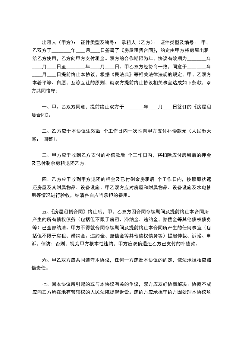 出租人(甲方): 证件类型及编号: 承租人(乙方): 证件类型及编号: 甲、乙双方于________年____月____日签署了《房屋租赁合同》,约定由甲方将房屋出租给乙方使用,乙方向甲方支付租金。双方的合作期限为年,协议有效期为________年____月____日至________年____月____日。甲乙双方经协商一致,同意于________年____月____日提前终止本协议,根据《民法典》等相关法律法规的规定,甲、乙双方本着平等、自愿、互谅互让的原则,就双方提前终止协议相关事宜达成如下条款,双方共同恪守: