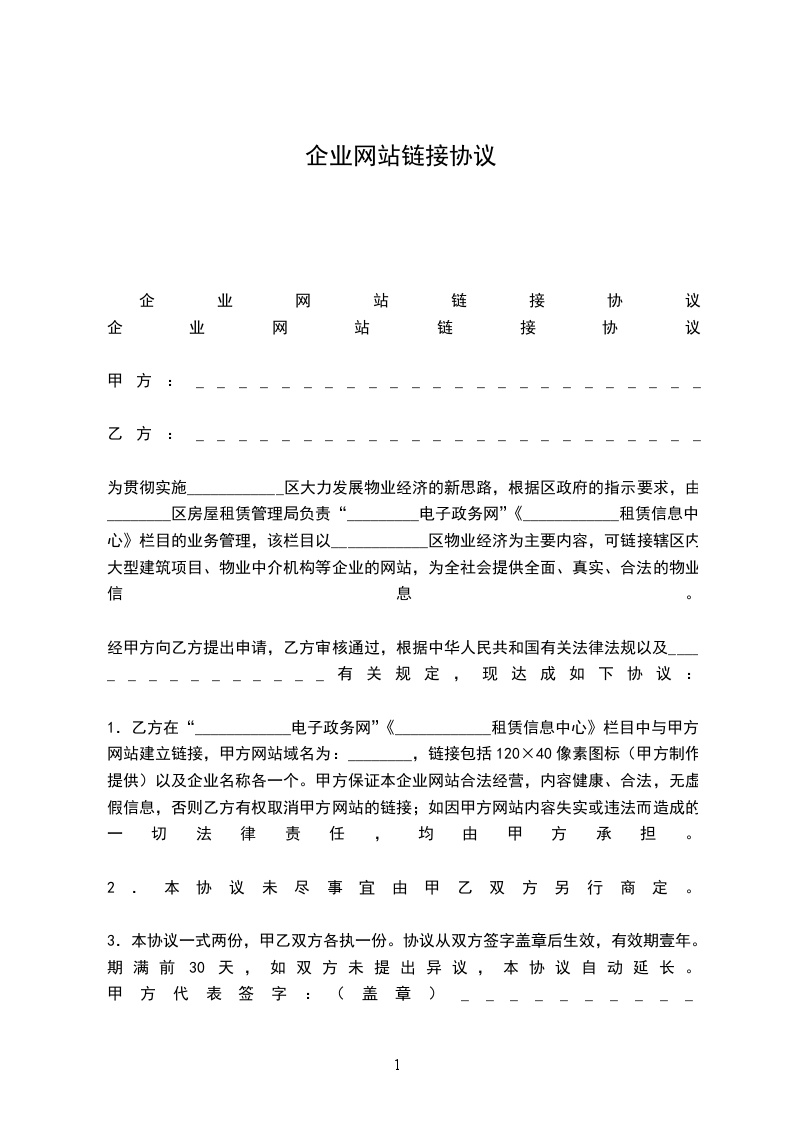 1.乙方在“____________电子政务网”《____________租赁信息中心》栏目中与甲方网站建立链接,甲方网站域名为:________,链接包括120×40像素图标(甲方制作提供)以及企业名称各一个。甲方保证本企业网站合法经营,内容健康、合法,无虚假信息,否则乙方有权取消甲方网站的链接;如因甲方网站内容失实或违法而造成的一切法律责任,均由甲方承担。