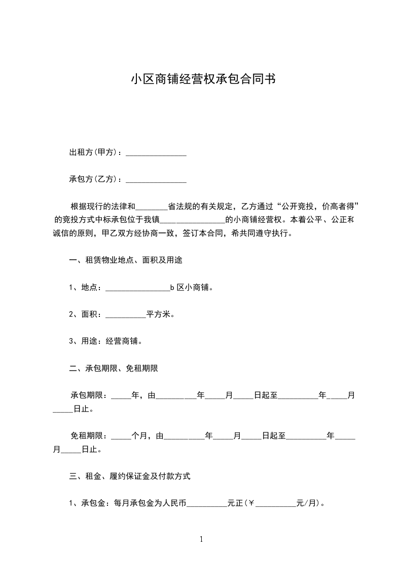 根据现行的法律和________省法规的有关规定,乙方通过“公开竞投,价高者得”的竞投方式中标承包位于我镇________________的小商铺经营权。本着公平、公正和诚信的原则,甲乙双方经协商一致,签订本合同,希共同遵守执行。