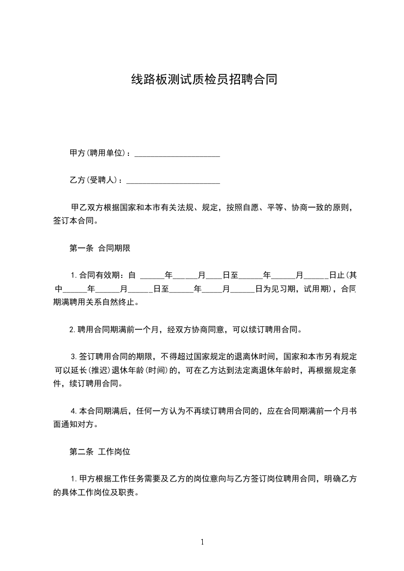 线路板测试质检员招聘合同