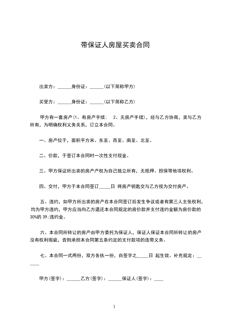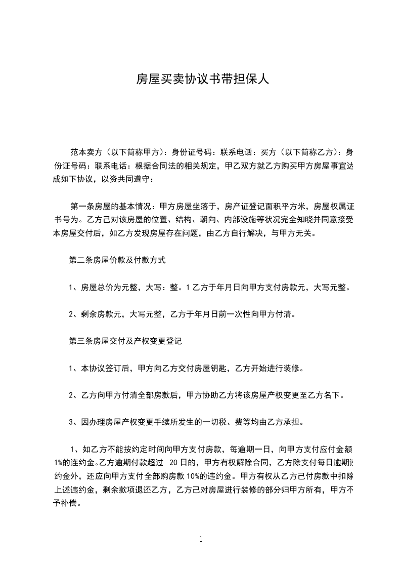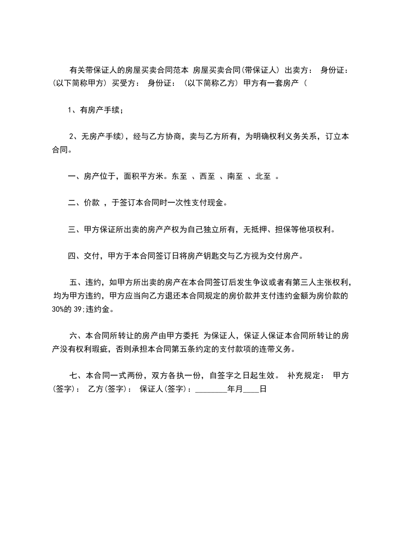 有关带保证人的房屋买卖合同范本 房屋买卖合同(带保证人) 出卖方: 身份证: (以下简称甲方) 买受方: 身份证: (以下简称乙方) 甲方有一套房产 (