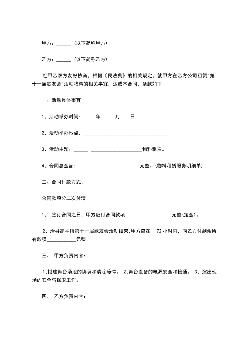 2、 滑县高平镇第十一届歌友会活动结束,甲方应在72小时内,向乙方付剩余所有款项____________元整