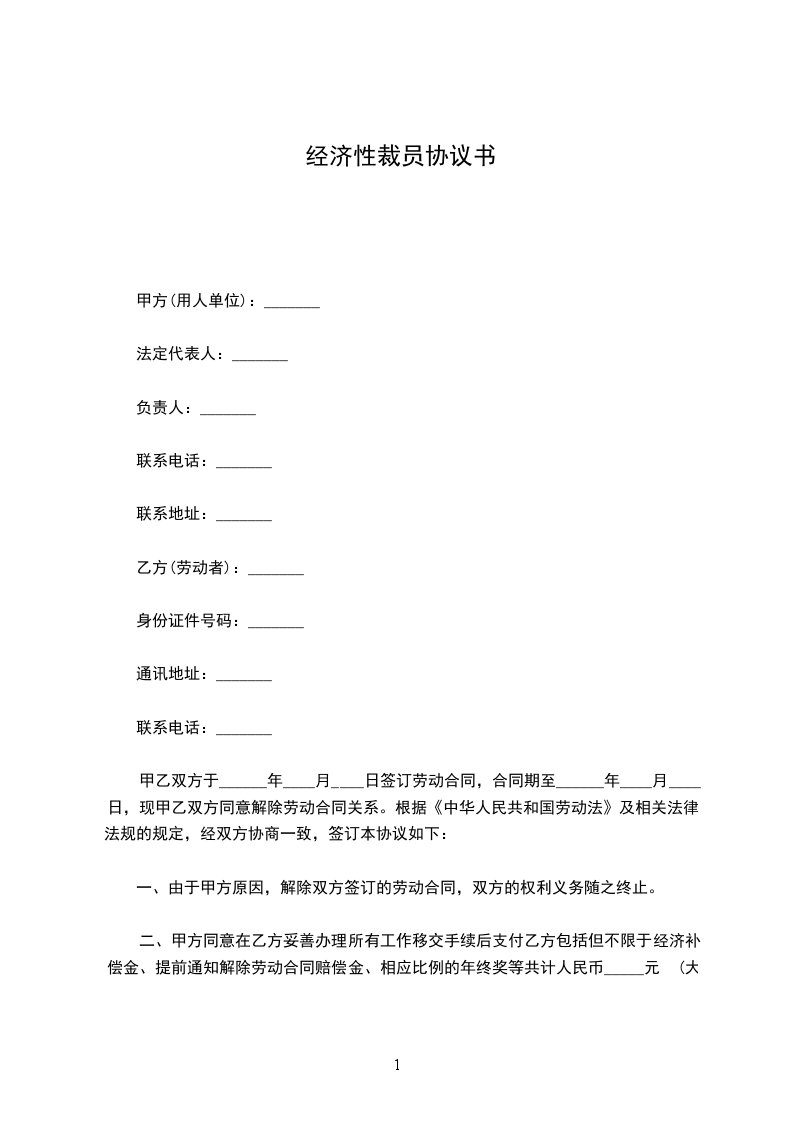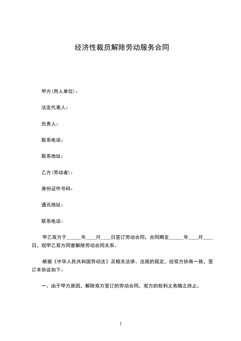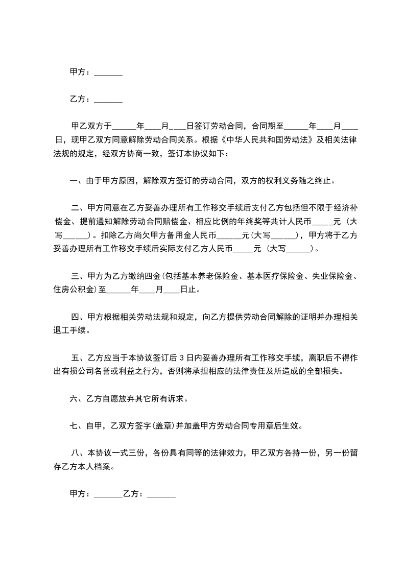 一、由于甲方原因,解除双方签订的劳动合同,双方的权利义务随之终止。