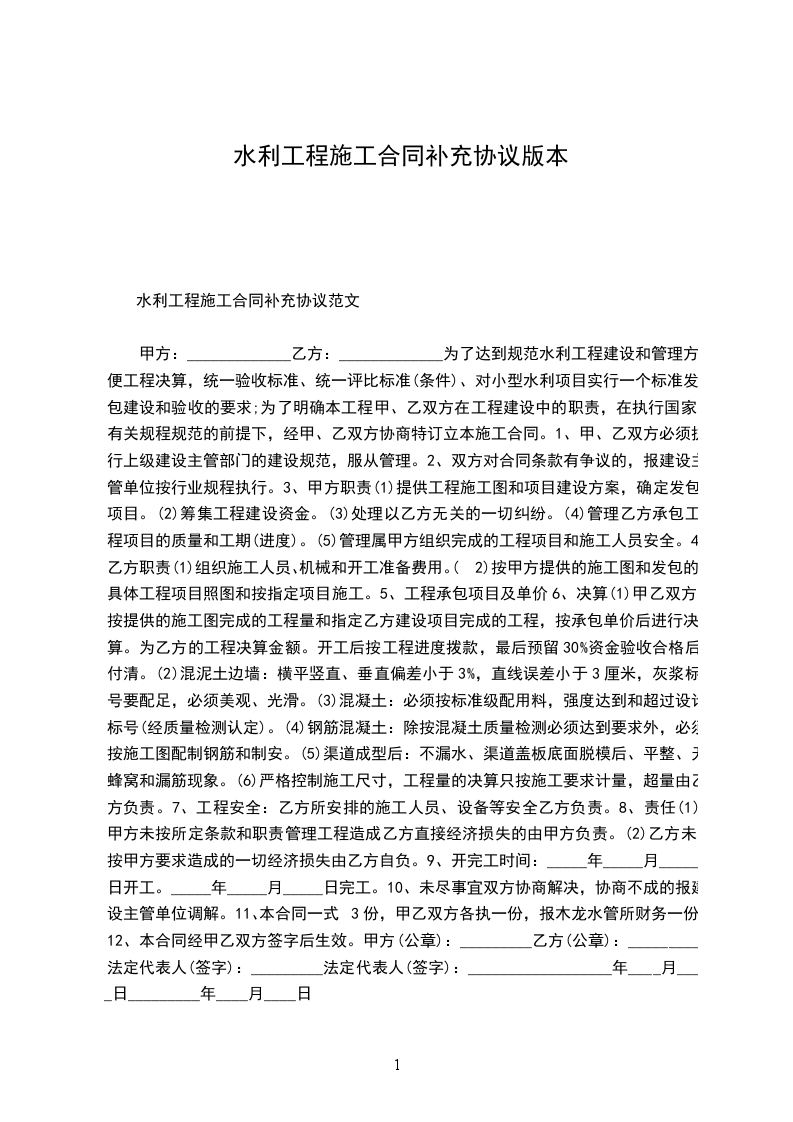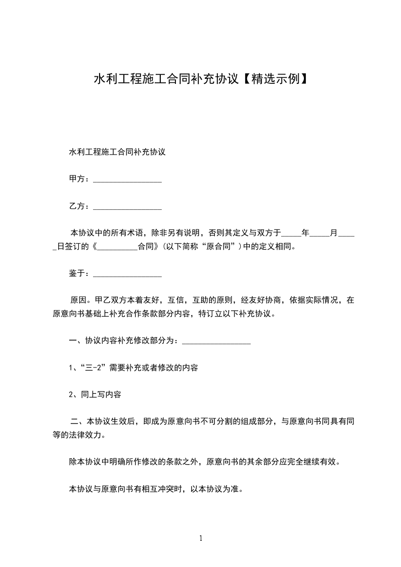 根据《中华人民共和国民法典》及有关法律、法规,遵循平等、自愿、公平和诚实信用的原则,甲、乙双方经友好协商,在原合同签订的基础上,就乙方承包______整治工程的给水工程及______道路改造工程的相关事项订立以下补充协议:_______