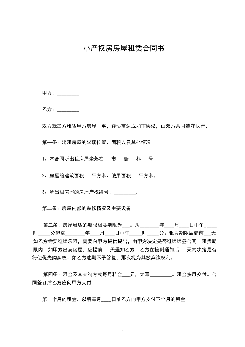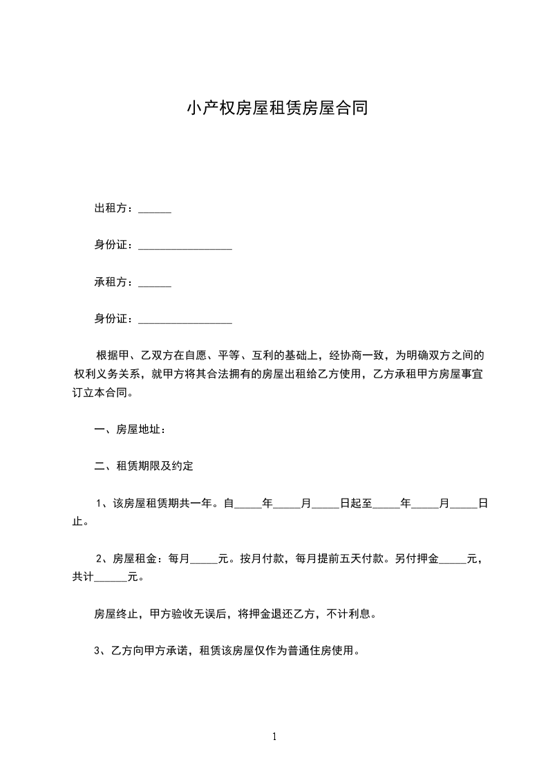 甲方(出租方):_________________身份证:________________ 乙方(承租方):_________________身份证:________________ 经双方协商一致,甲方将坐落于______________________________房屋出租给乙方使用。