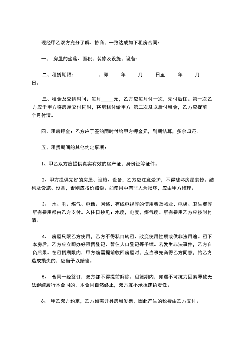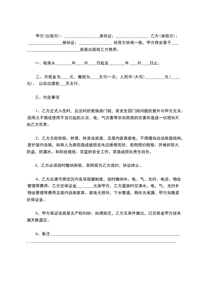 4、乙方应遵守居住区内各项规章制度,按时缴纳水、电、气、光纤、电话、物业管理等费用。乙方交保证金________元给甲方,乙方退房时交清水,电,气,光纤和物业管理等费用及屋内设施家具、家电无损坏,下水管道,厕所无堵漏。甲方如数退还保证金。