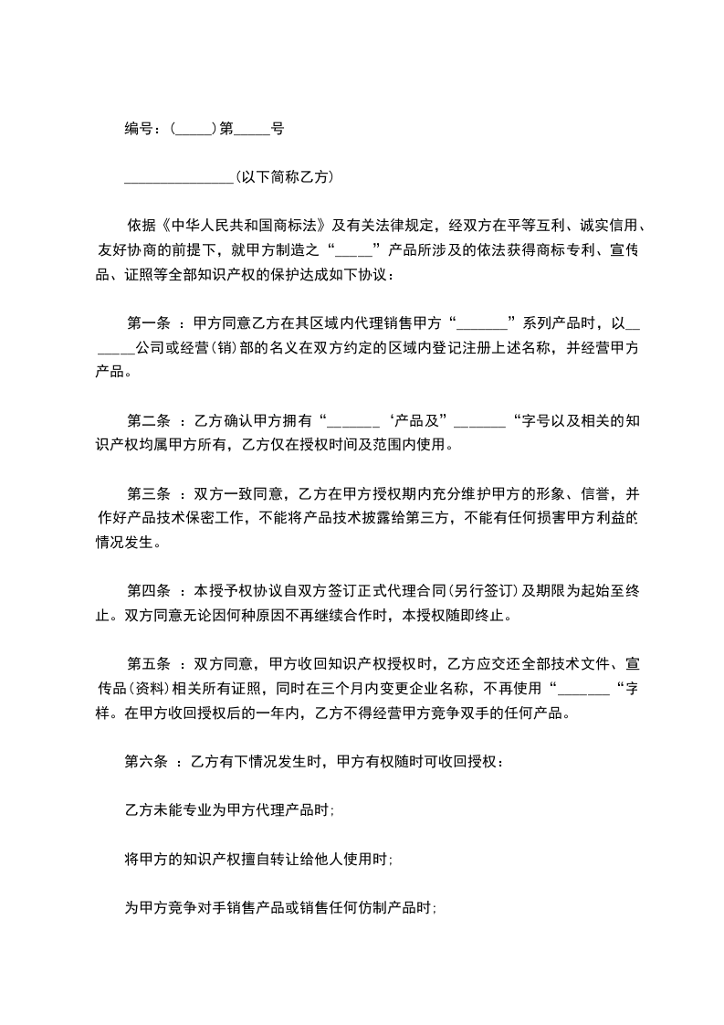 依据《中华人民共和国商标法》及有关法律规定,经双方在平等互利、诚实信用、友好协商的前提下,就甲方制造之“_____”产品所涉及的依法获得商标专利、宣传品、证照等全部知识产权的保护达成如下协议:
