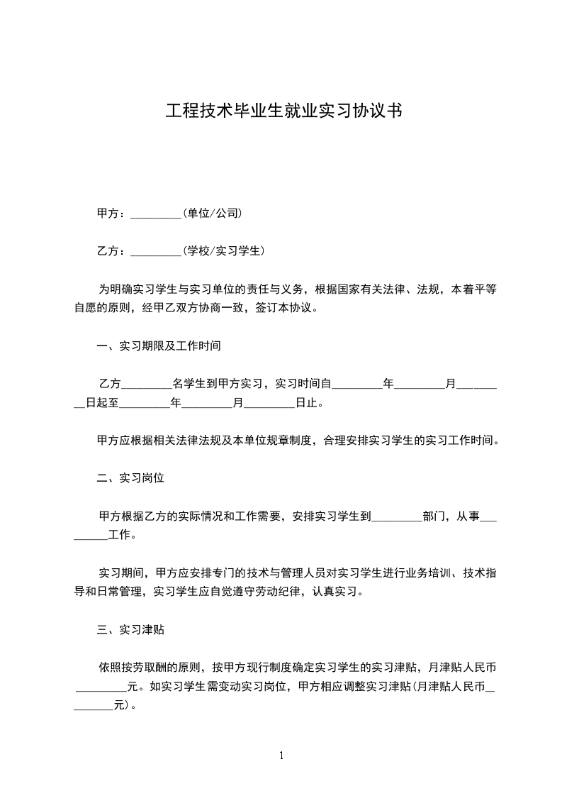 依照按劳取酬的原则,按甲方现行制度确定实习学生的实习津贴,月津贴人民币_________元。如实习学生需变动实习岗位,甲方相应调整实习津贴(月津贴人民币_________元)。