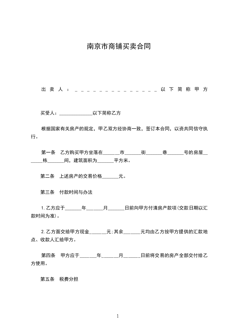 第一条 乙方购买甲方坐落在_______市_______街_______巷_______号的房屋_______栋_______间,建筑面积为_______平方米。