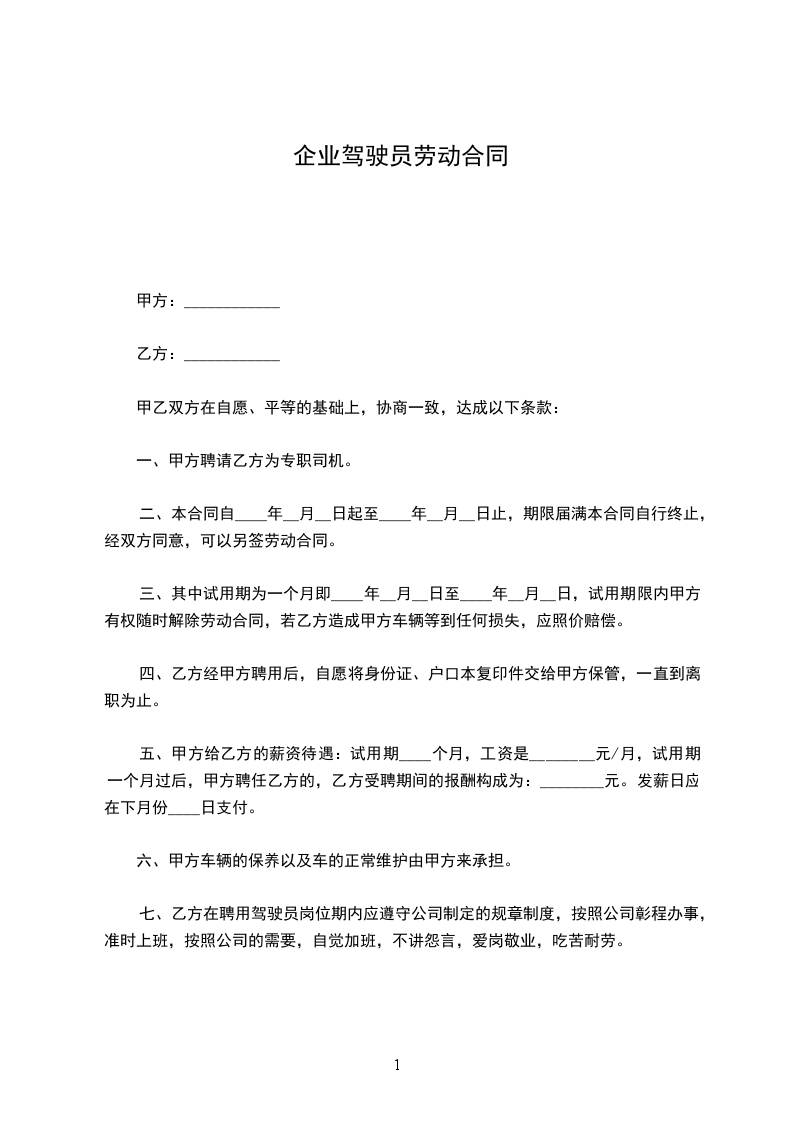 七、乙方在聘用驾驶员岗位期内应遵守公司制定的规章制度,按照公司彰程办事,准时上班,按照公司的需要,自觉加班,不讲怨言,爱岗敬业,吃苦耐劳。
