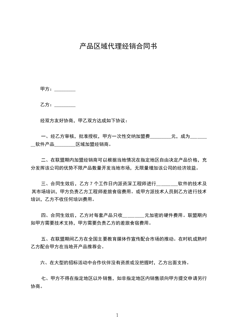 一、经乙方审核,批准授权,甲方一次性交纳加盟费_________元,成为_________软件产品_________区域加盟经销商。