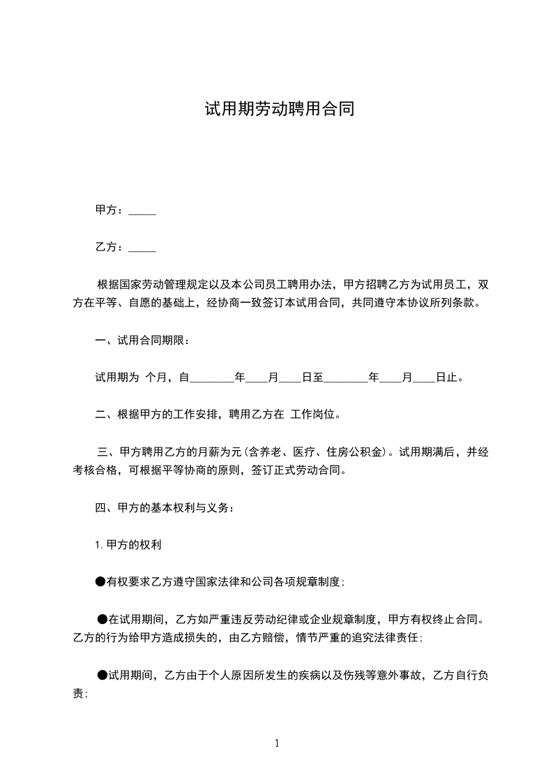 根据国家劳动管理规定以及本公司员工聘用办法,甲方招聘乙方为试用员工,双方在平等、自愿的基础上,经协商一致签订本试用合同,共同遵守本协议所列条款。