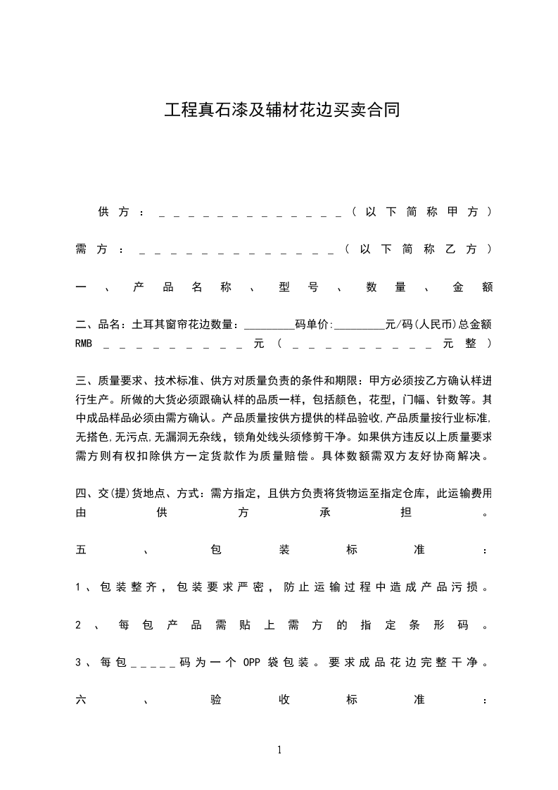 二、品名:土耳其窗帘花边数量:_________码单价:_________元/码(人民币)总金额:RMB_________元(_________元整)