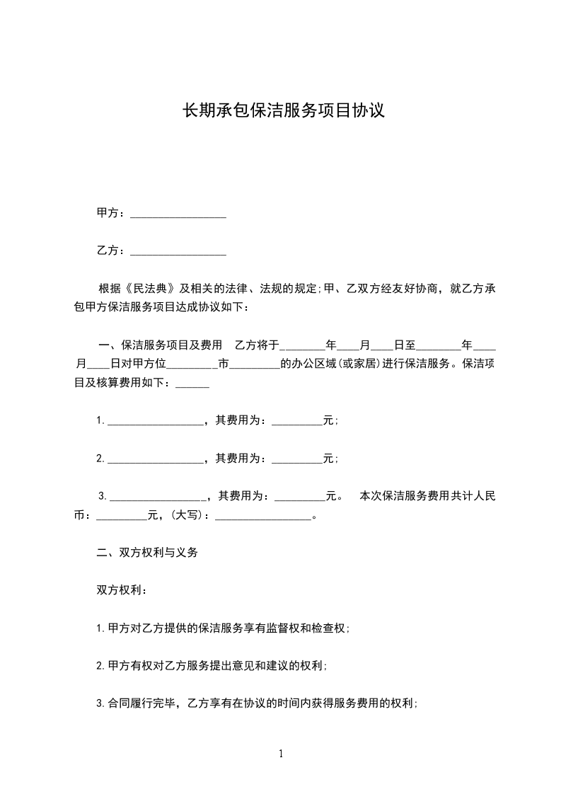 根据《民法典》及相关的法律、法规的规定;甲、乙双方经友好协商,就乙方承包甲方保洁服务项目达成协议如下: