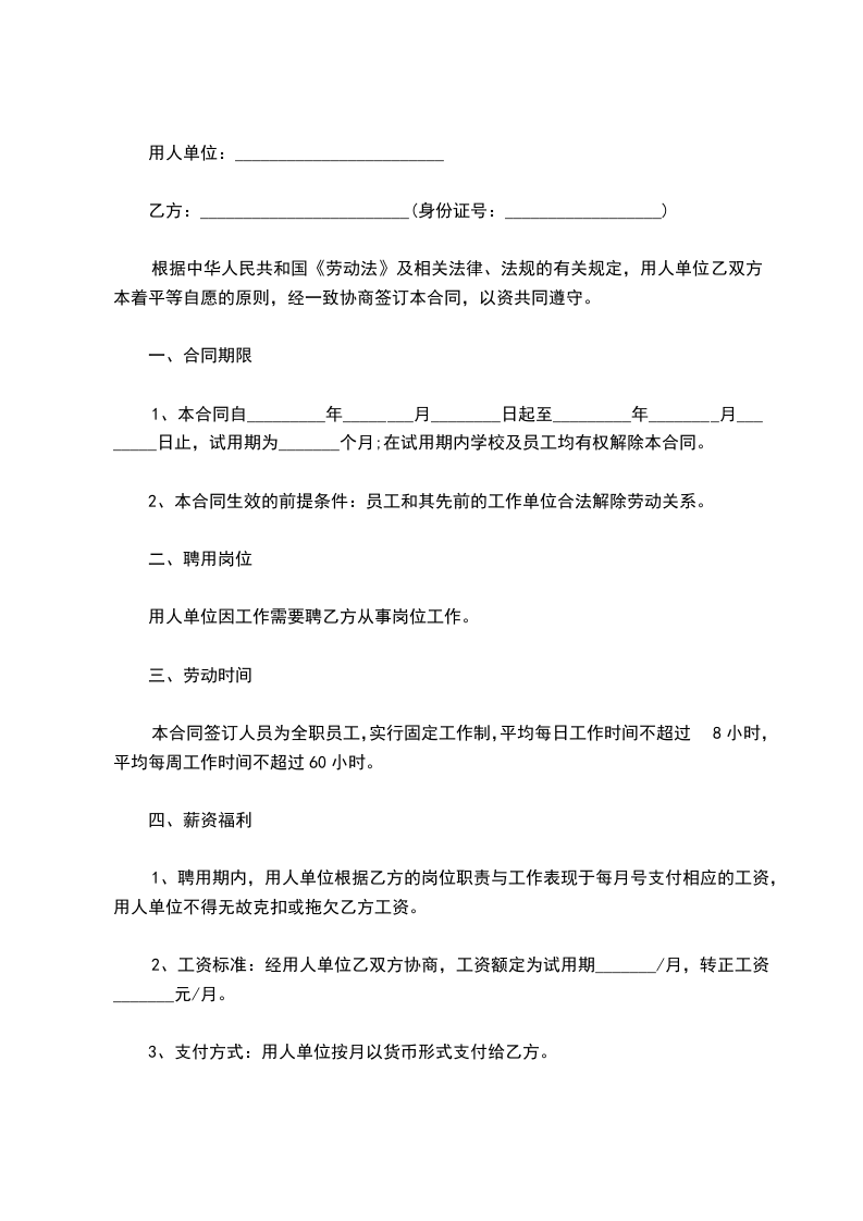1、固定期限。合同期自________年____月____日起,至________年____月____日止。其中,试用期自________年____月____日起,至________年____月____日止。