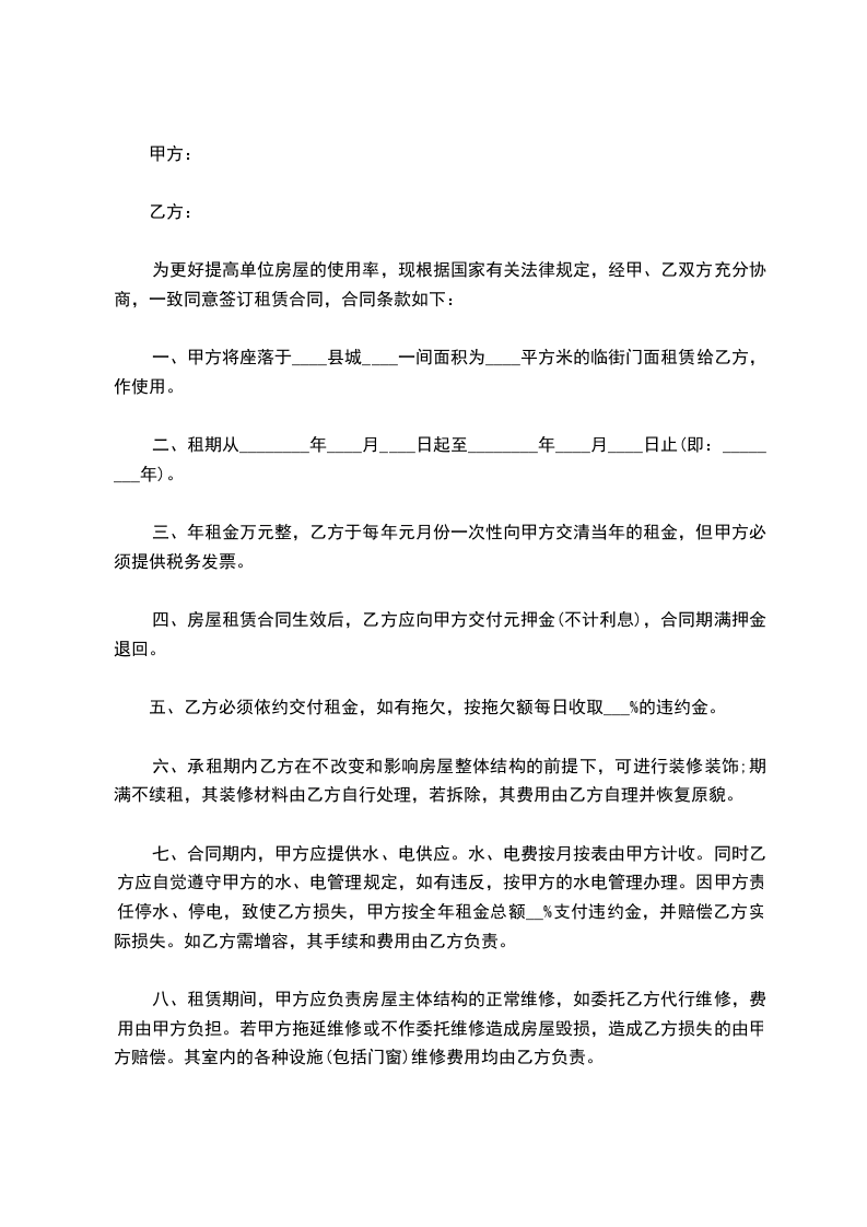 1、甲方租给乙方的地址经营面积为_____平方米的房屋,租赁给乙方作日用品店使用。