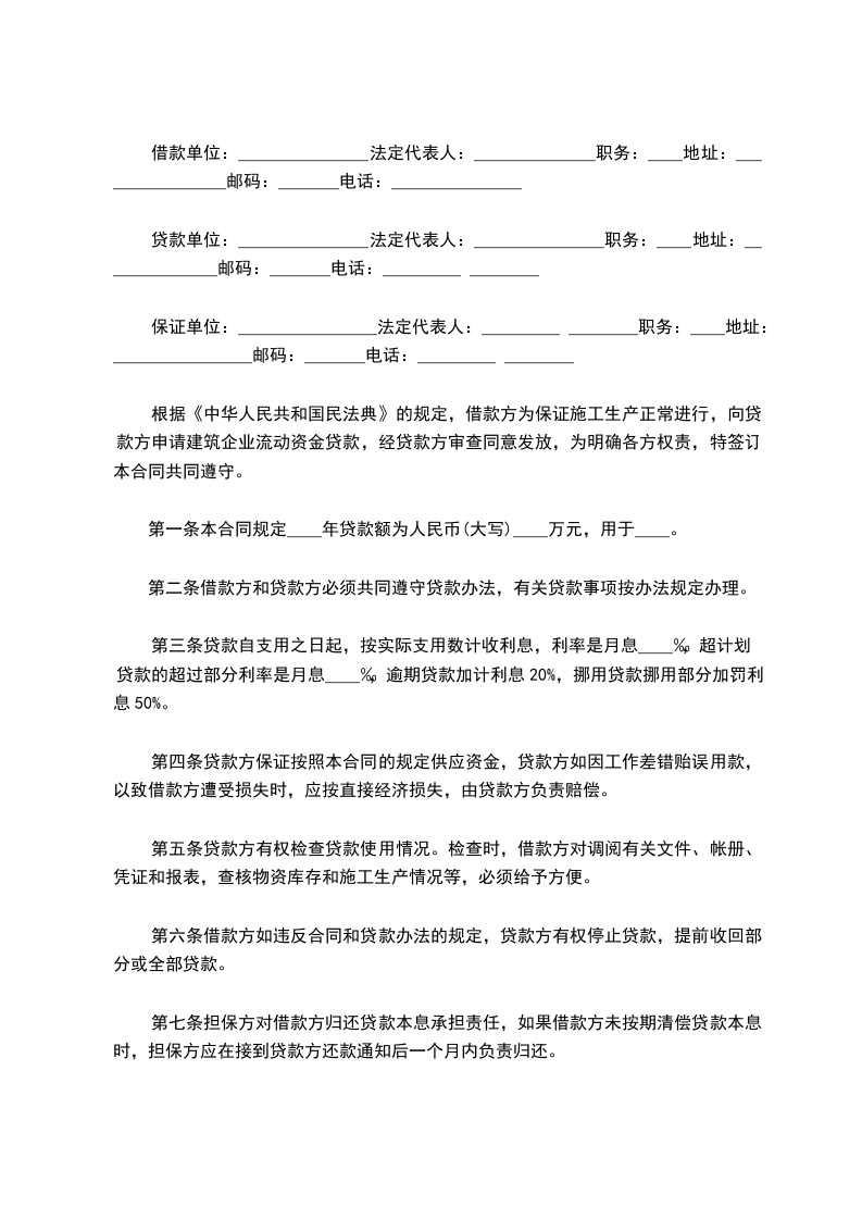 根据《中华人民共和国民法典》的规定,借款方为保证施工生产正常进行,向贷款方申请建筑企业流动资金贷款,经贷款方审查同意发放,为明确各方权责,特签订本合同共同遵守。