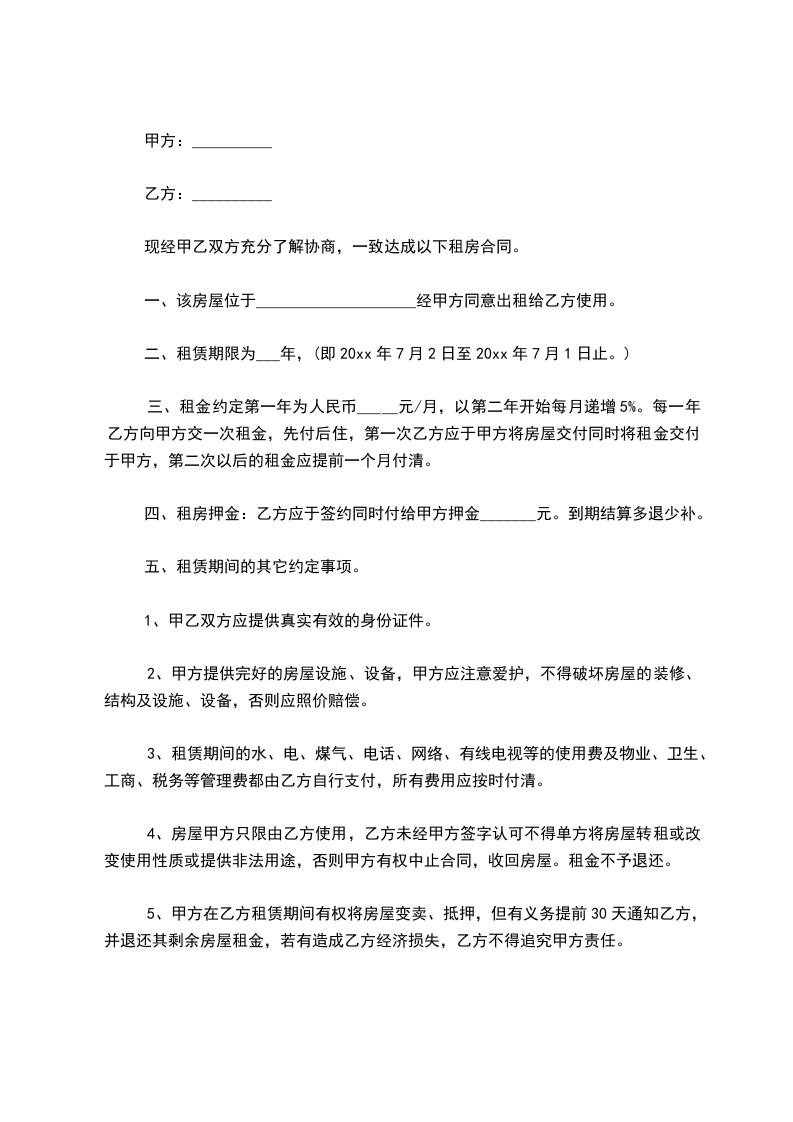 第十条从签字之日起租用期必须有________年时间,否则不退押金。假如________年之内甲方续建、转卖,乙方必须无条件搬出。甲方不负乙方任何责任。