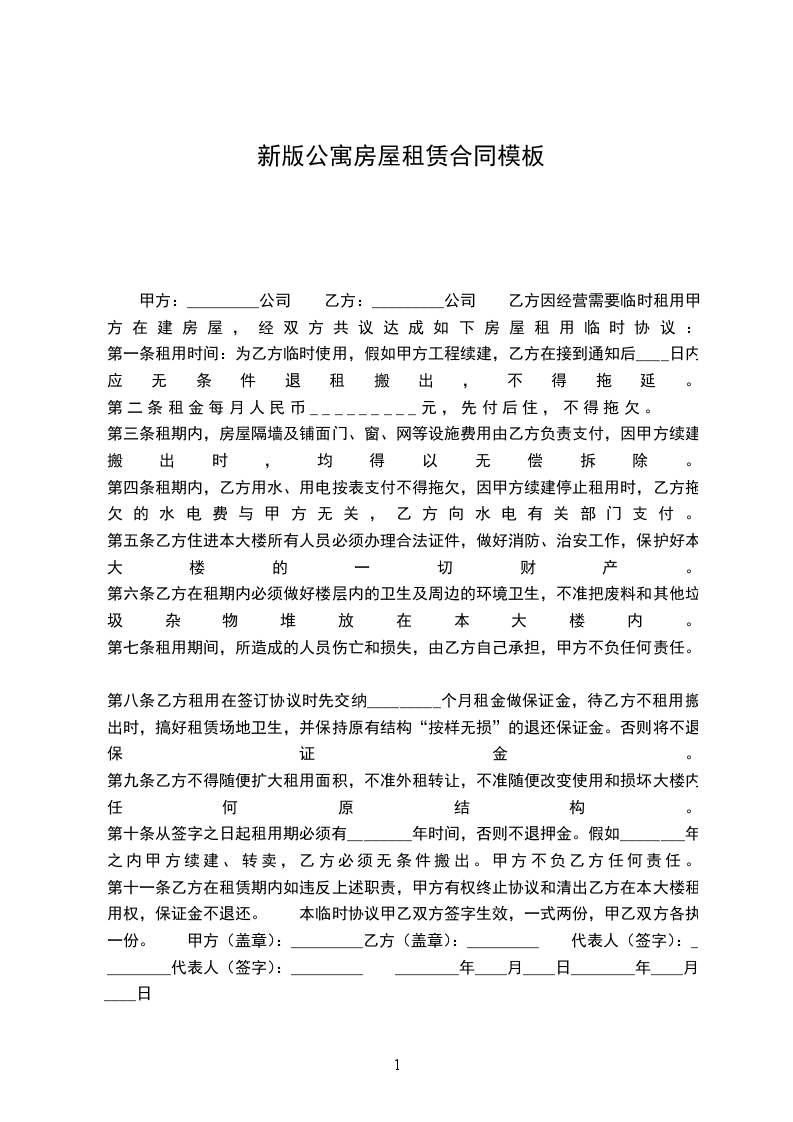 甲方:_________公司 乙方:_________公司 乙方因经营需要临时租用甲方在建房屋,经双方共议达成如下房屋租用临时协议: