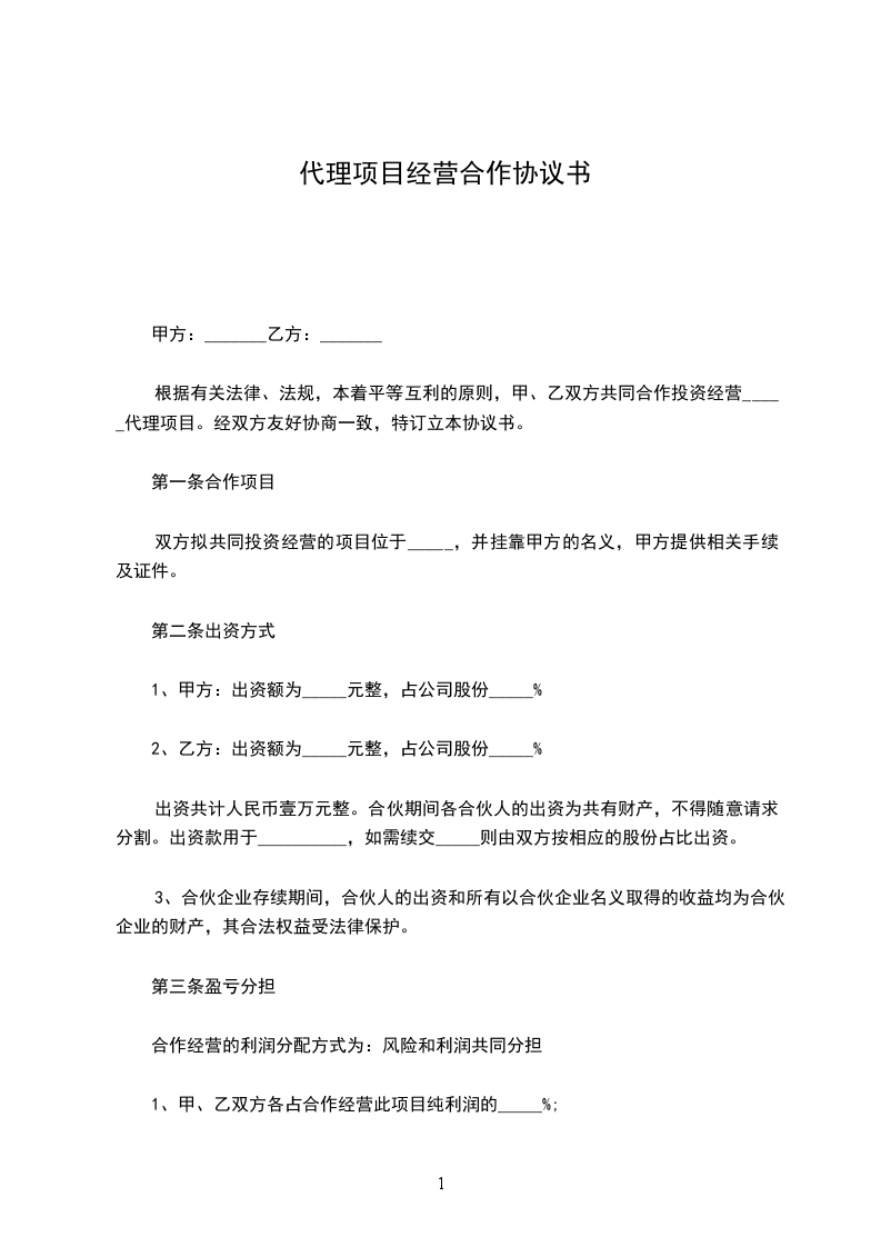 根据有关法律、法规,本着平等互利的原则,甲、乙双方共同合作投资经营_____代理项目。经双方友好协商一致,特订立本协议书。