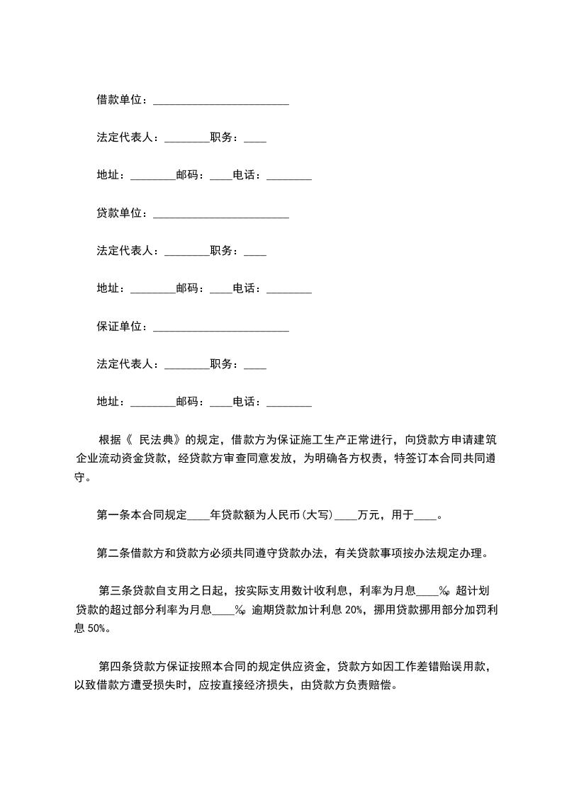 根据《 民法典》的规定,借款方为保证施工生产正常进行,向贷款方申请建筑企业流动资金贷款,经贷款方审查同意发放,为明确各方权责,特签订本合同共同遵守。