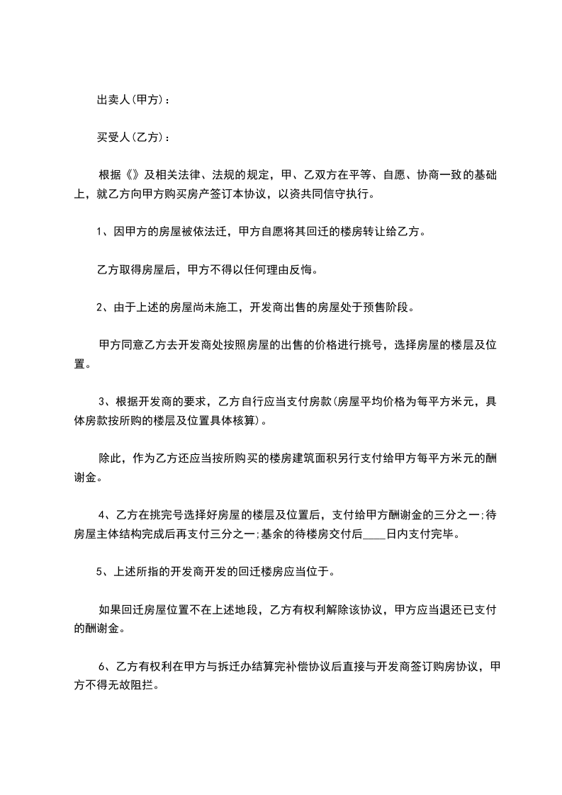 九、本协议签订后,双方应该共同遵守。如违约,违约方除赔偿对方相应经济损失外,还应该赔偿对方房屋总价款20%的违约金。
