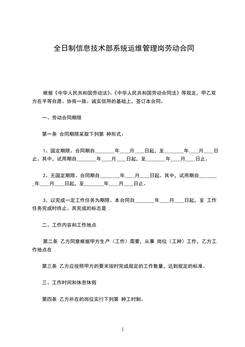 1、固定期限。合同期自________年____月____日起,至________年____月____日止。其中,试用期自________年____月____日起,至________年____月____日止。