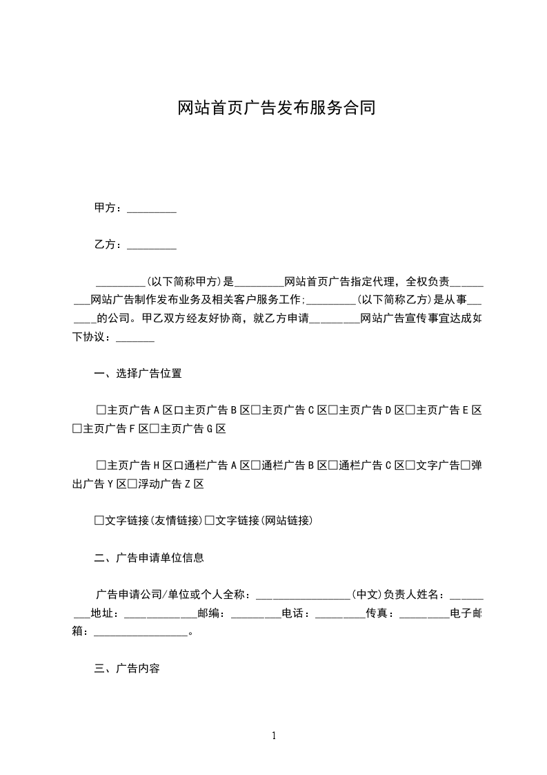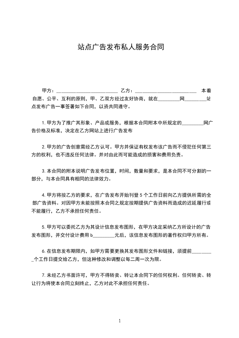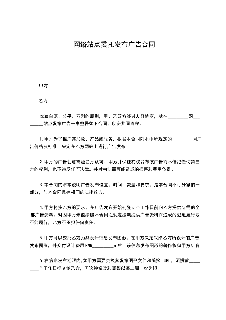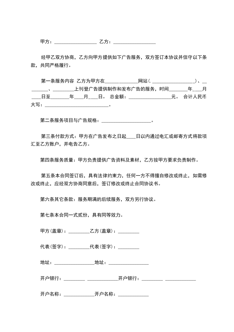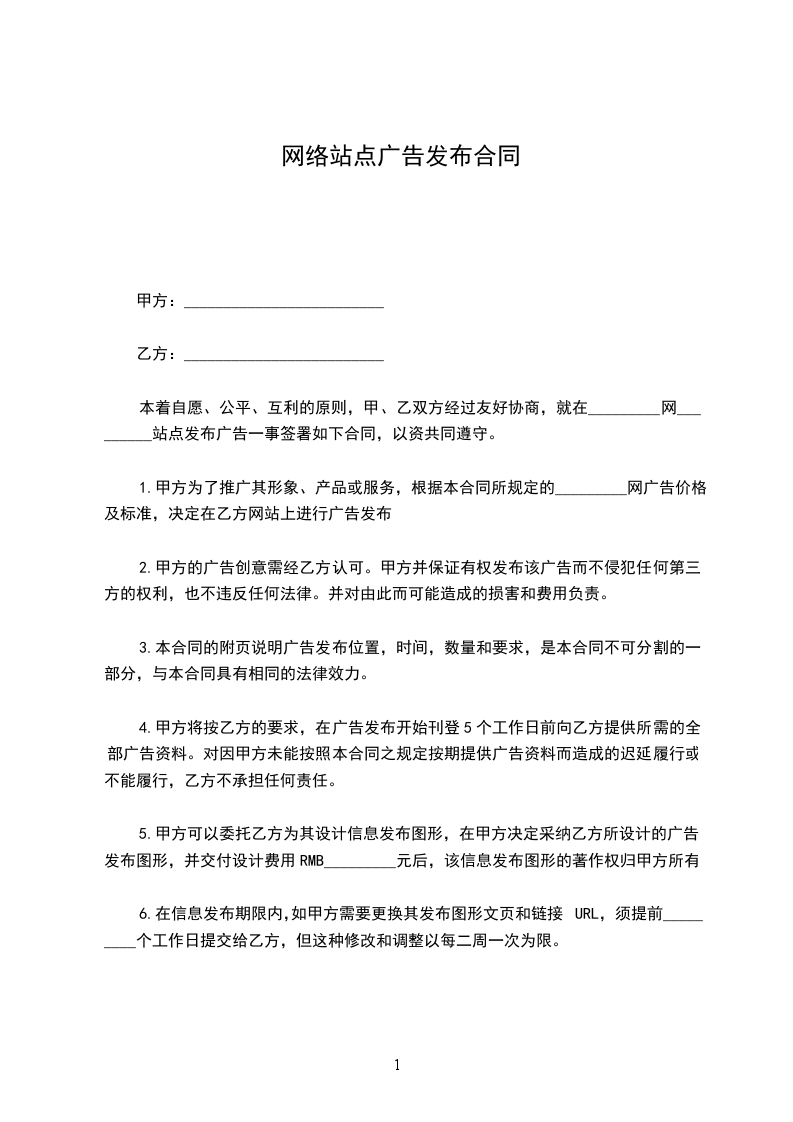 甲方:_________________________ 乙方:_________________________ 本着自愿、公平、互利的原则,甲、乙双方经过友好协商,就在_________网_________站点发布广告一事签署如下合同,以资共同遵守。
