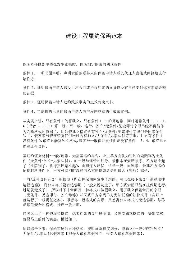 从实质上讲,只有条件1的算独立,只有条件1、2的算连带,同时附带条件1、2、3、4(或者1、2、3)算一般。至一般,连带,独立/无条件/见索即付字眼已经不再能作为判断格式的依据了。比如假独立格式含有独立/无条件/见索即付字眼但是附带条件3、4。假连带写着连带责任但同时含有独立/无条件/见索即付等字眼,且只有条件1,没有条件2,最终只能算独立格式。或者写一般保证责任但是没有条件3、4,最终也只能算连带责任。