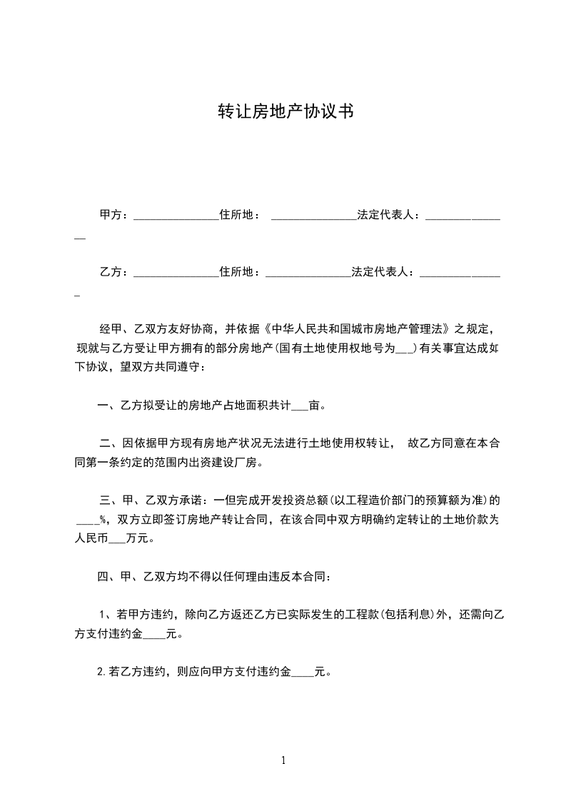 三、甲、乙双方承诺:一但完成开发投资总额(以工程造价部门的预算额为准)的__________%,双方立即签订房地产转让协议,在该协议中双方明确约定转让的土地价款为人民币__________万元。