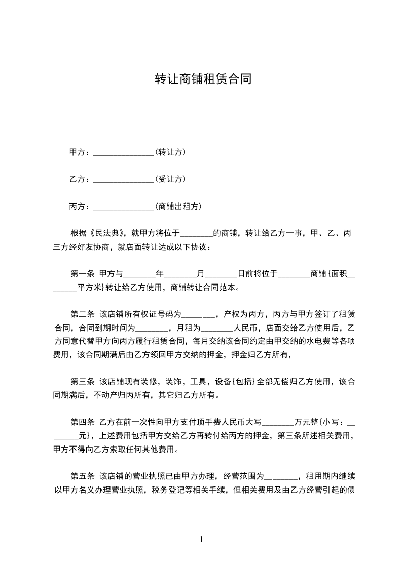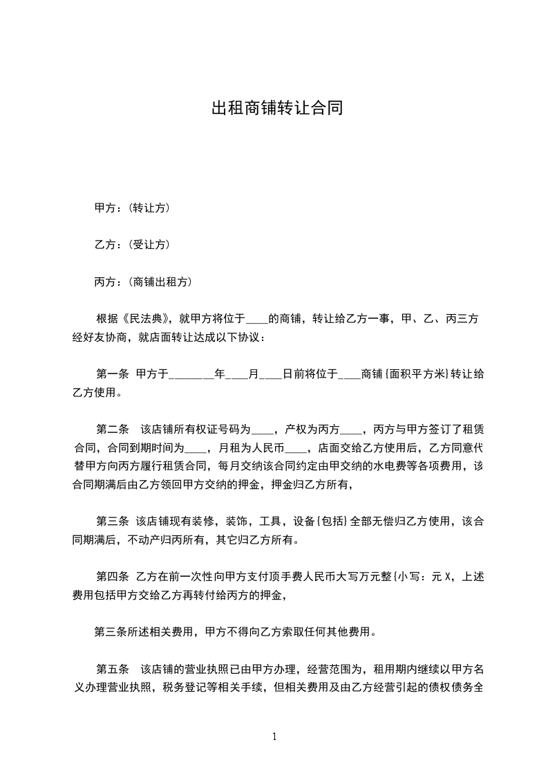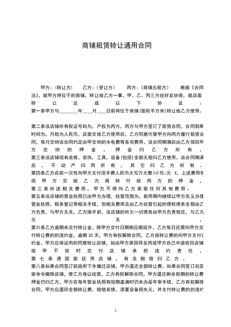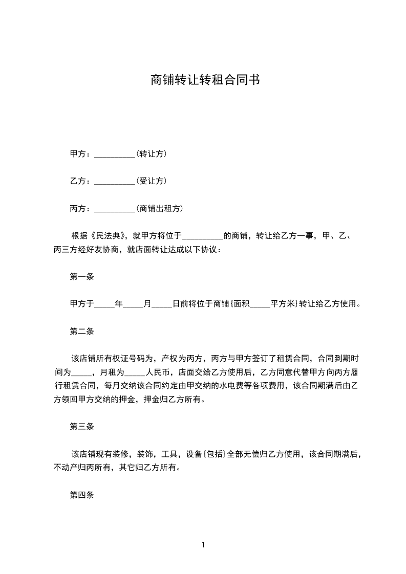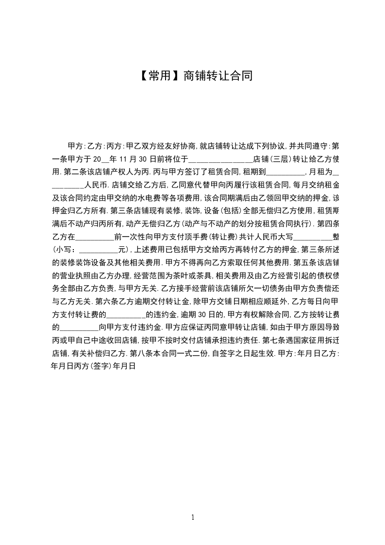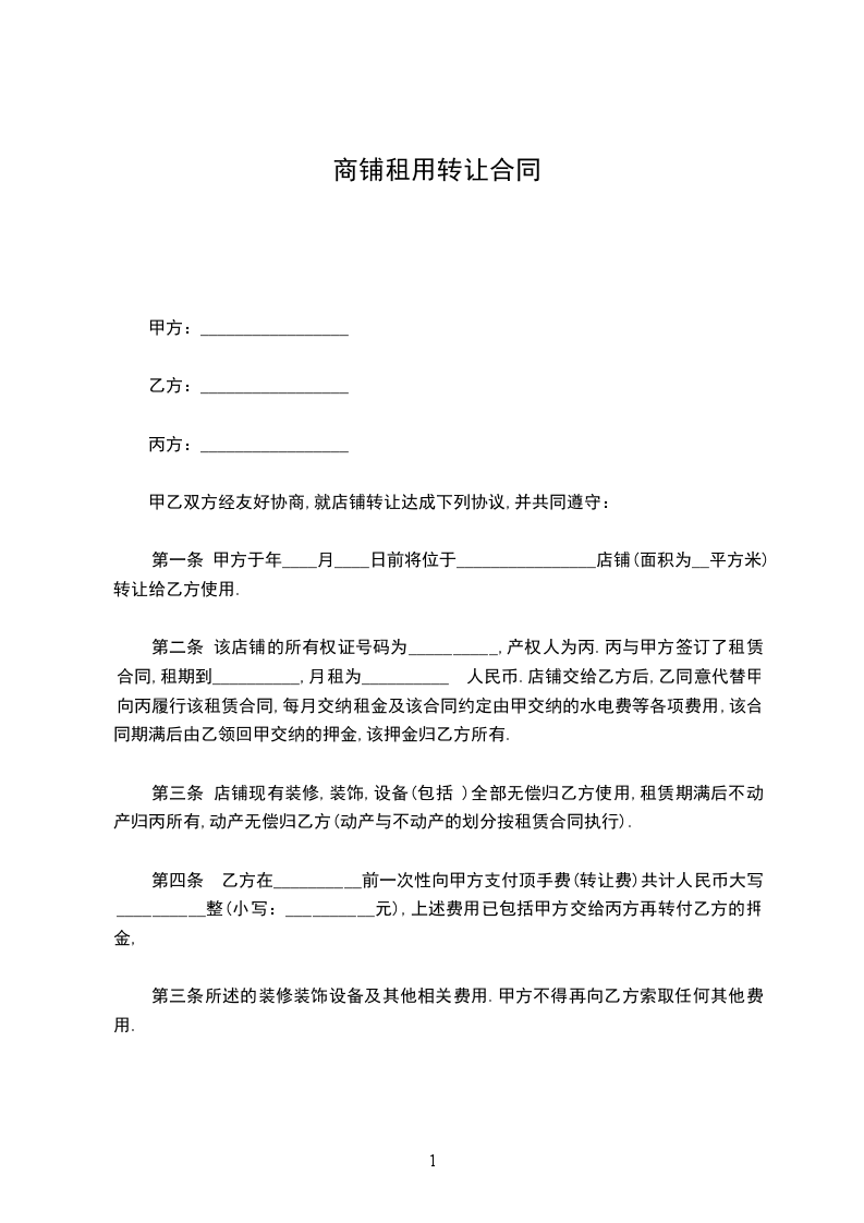 第一条 甲方于年____月____日前将位于________________店铺(面积为__平方米)转让给乙方使用.