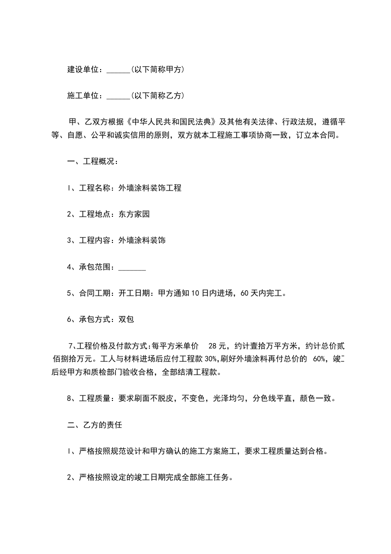 7、工程价格及付款方式:每平方米单价28元,约计壹拾万平方米,约计总价贰佰捌拾万元。工人与材料进场后应付工程款30%,刷好外墙涂料再付总价的60%,竣工后经甲方和质检部门验收合格,全部结清工程款。