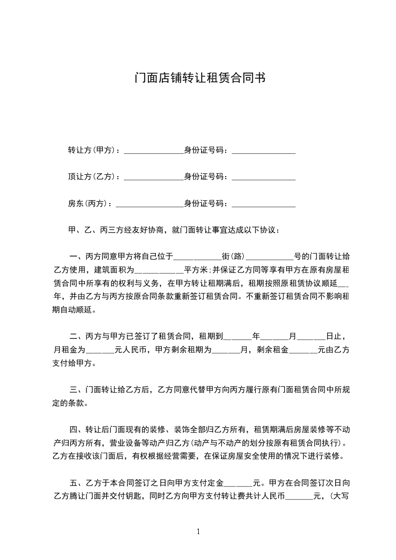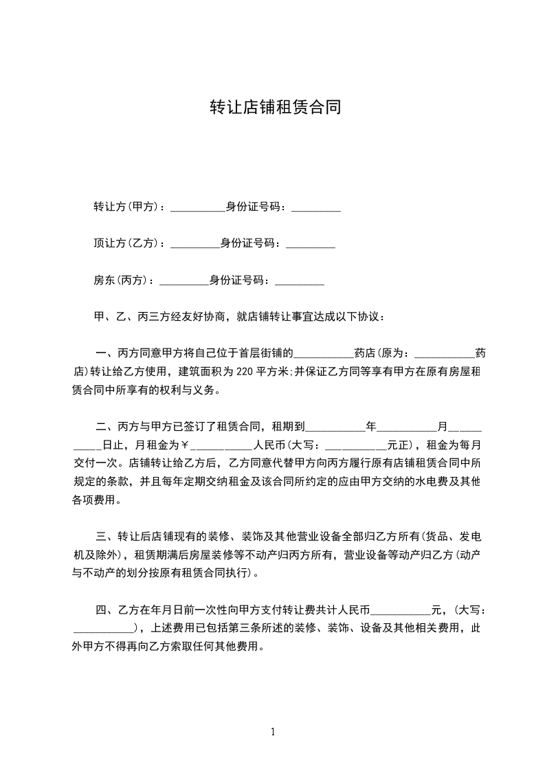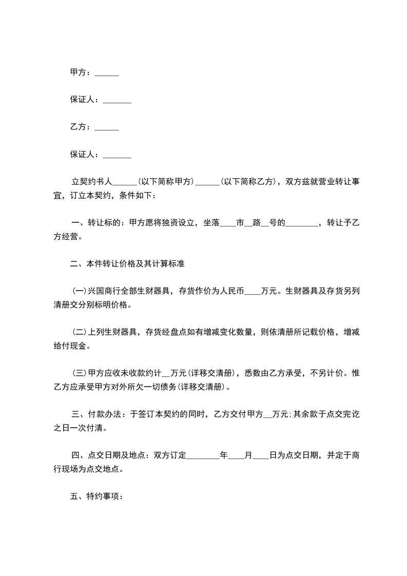 一、转让标的:甲方愿将独资设立,坐落____市__路__号的________,转让予乙方经营。