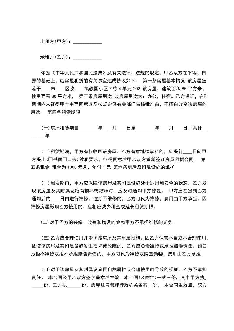 甲方(出租方):__________ 乙方(承租方):__________ 根据《中华人民共和国民法典》和《中华人民共和国____市房地产管理法》等规定,为保障甲、乙双方的合法权益,经双方协商一致,签订本合同。