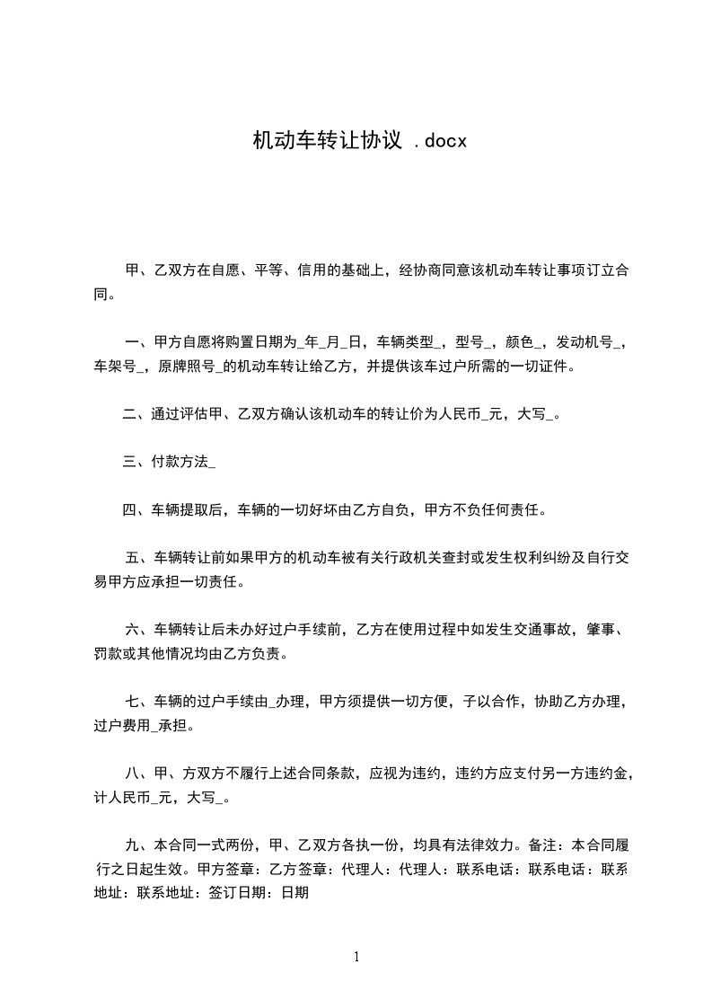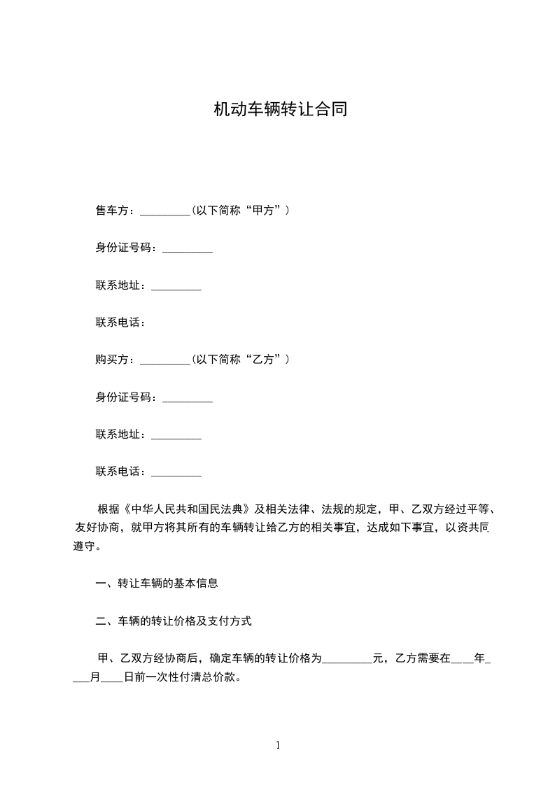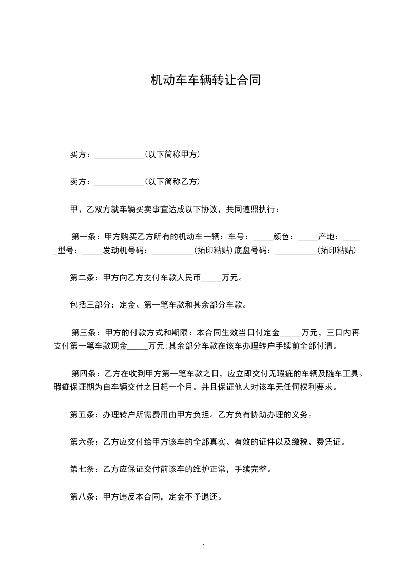 一、甲方自愿将购置日期为________年____月____日,车辆类型__________,型号__________,颜色__________,发动机号__________,车架号__________,原牌照号__________的机动车转让给乙方,并提供该车过户所需的一切证件。