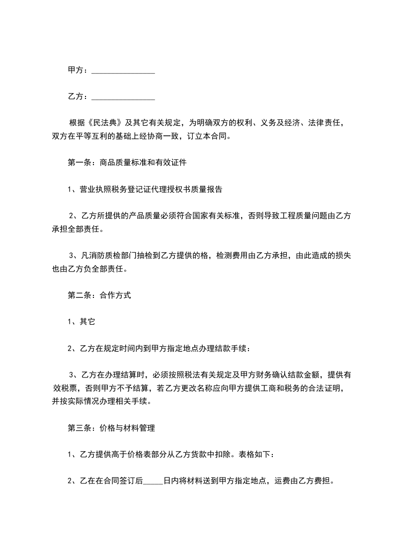 3、乙方在向甲方提供材料时,必须均为优等品。首先要提供样品。样品要符合甲方所需材料质量要求,不得以次充好,若发现质量问题甲方将从材料总金额中扣除50%作为惩罚。