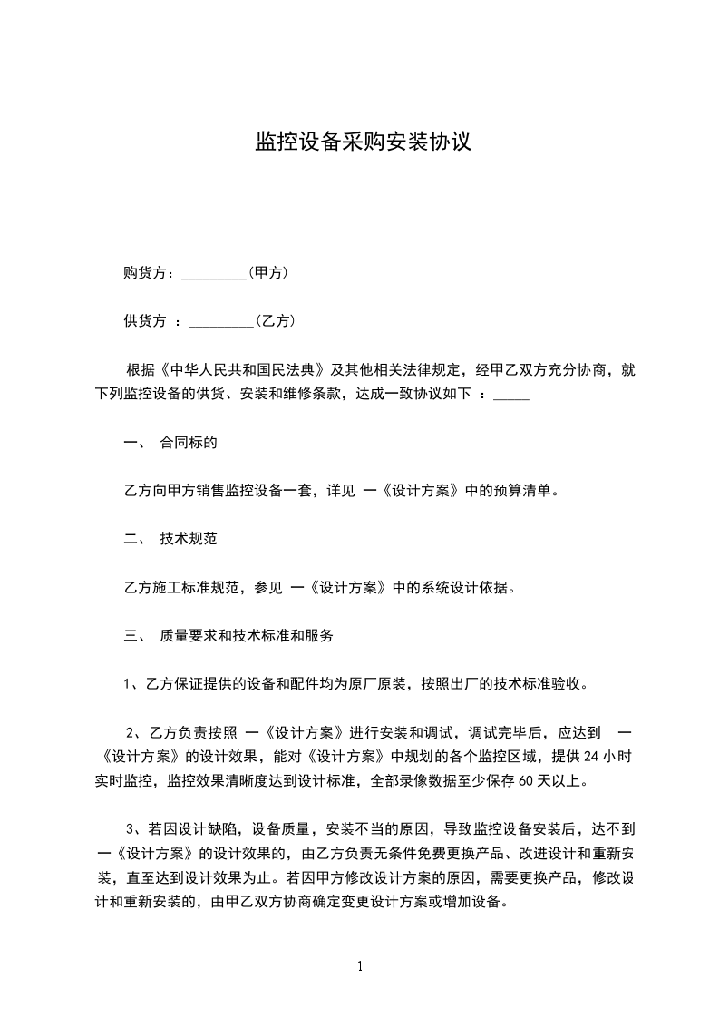 3、乙方严格按照甲方指定的位置安装布线,设备安装上后,如果甲方需要更换位置而产生移装费用由甲方负责。不是因为产品质量而造成的设备损坏,更换费有甲方负责,乙方提供安装。设备安装完后,使用过程中甲方应及时发现有隐患确保安全的条件下自己处理,不能处理的报乙方维护(________年内维护),超过服务期限的,维护费用另行结算。乙方仅负责监控设备的安装调试,不承担由监控设备原因造成的一切损失。