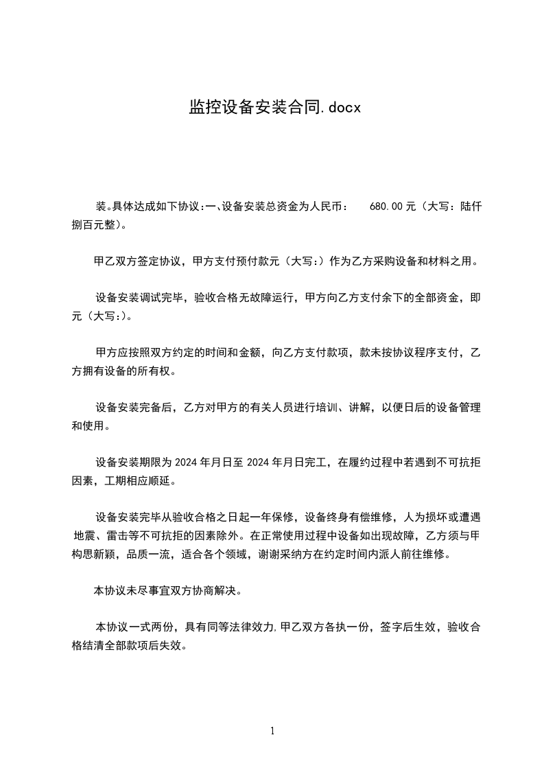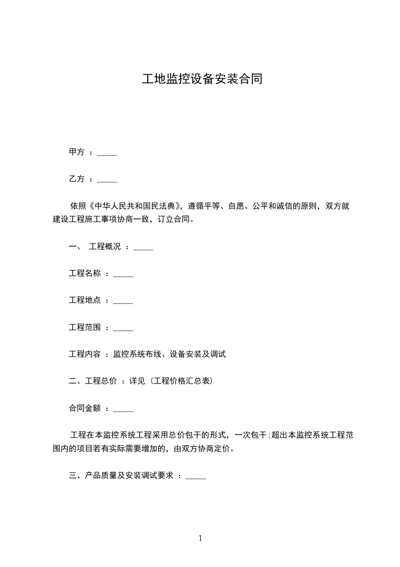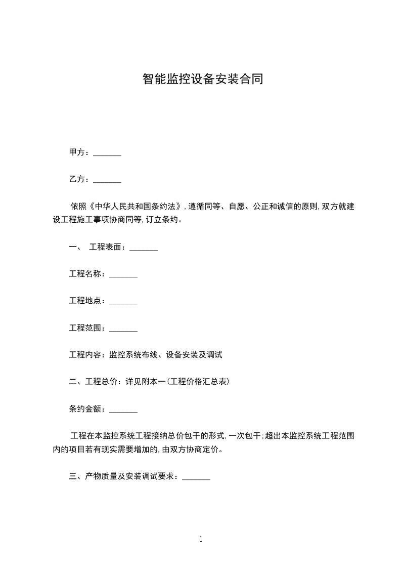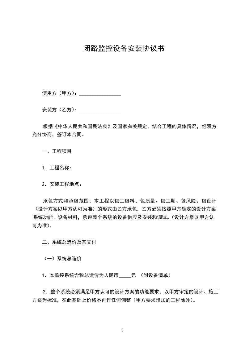 经甲、乙双方共同商定,甲方购买乙方监控设备,并由乙方负责安装调试,工程(包括监控设备)造价人民币大写:_______(详见附表) 元。并达成以下协议: