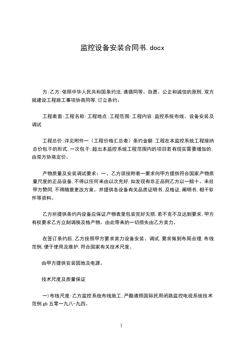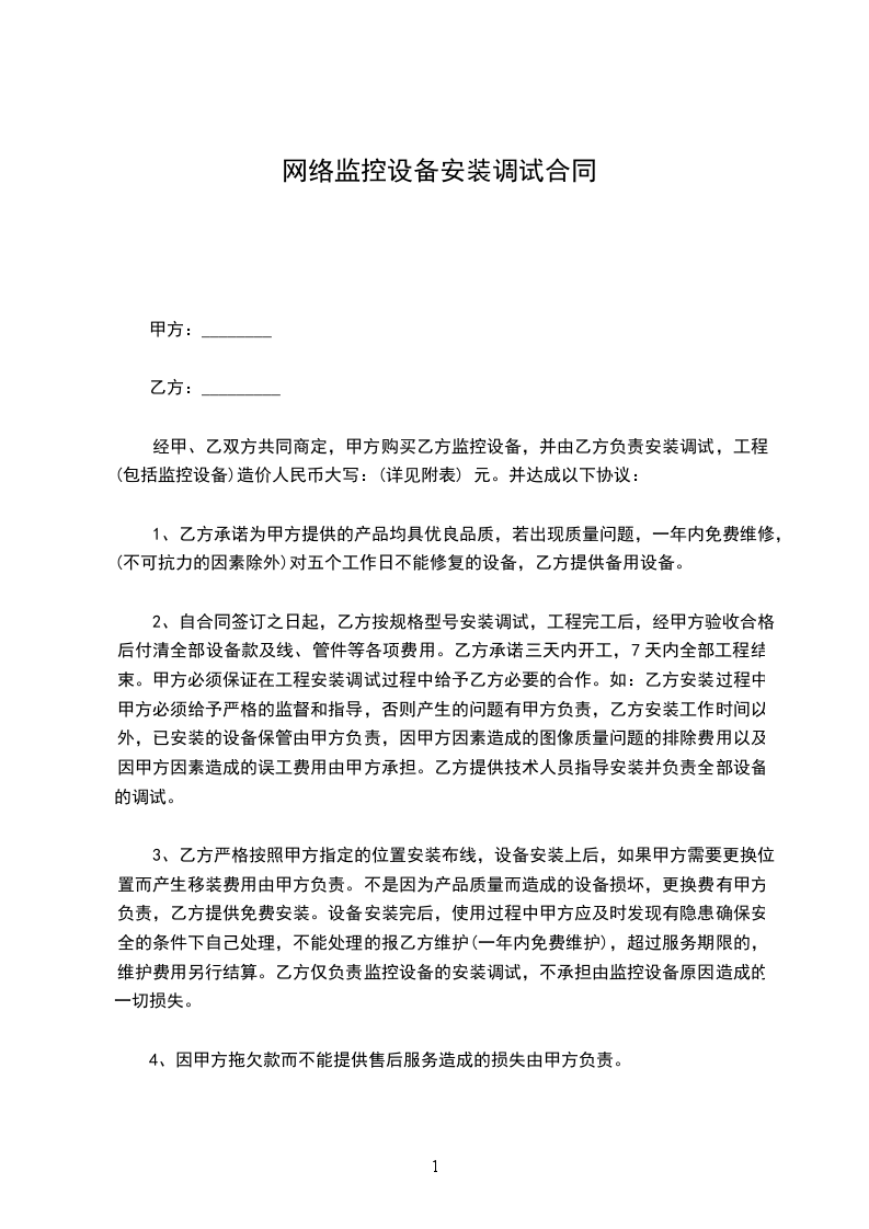 2、自合同签订之日起,乙方按规格型号安装调试,工程完工后,经甲方验收合格后付清全部设备款及线、管件等各项费用。乙方承诺三天内开工,7天内全部工程结束。甲方必须保证在工程安装调试过程中给予乙方必要的合作。如:乙方安装过程中甲方必须给予严格的`监督和指导,否则产生的问题有甲方负责,乙方安装工作时间以外,已安装的设备保管由甲方负责,因甲方因素造成的图像质量问题的排除费用以及因甲方因素造成的误工费用由甲方承担。乙方提供技术人员指导安装并负责全部设备的调试。